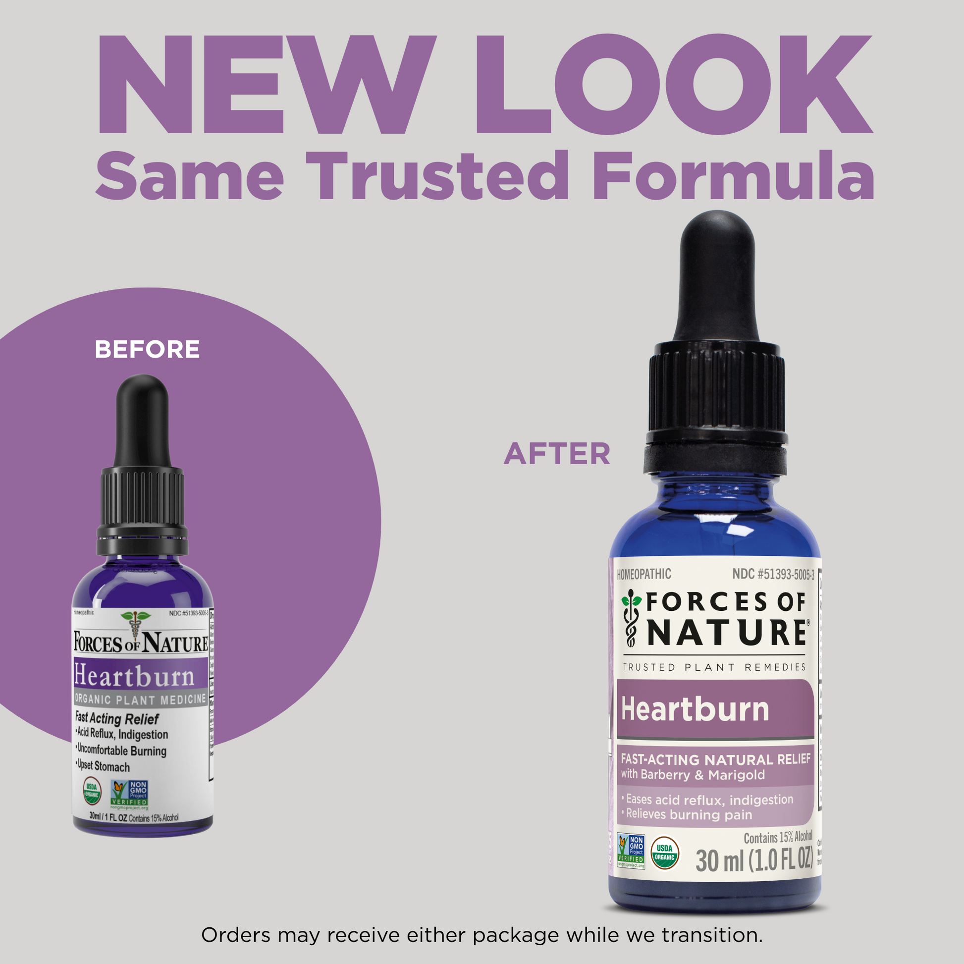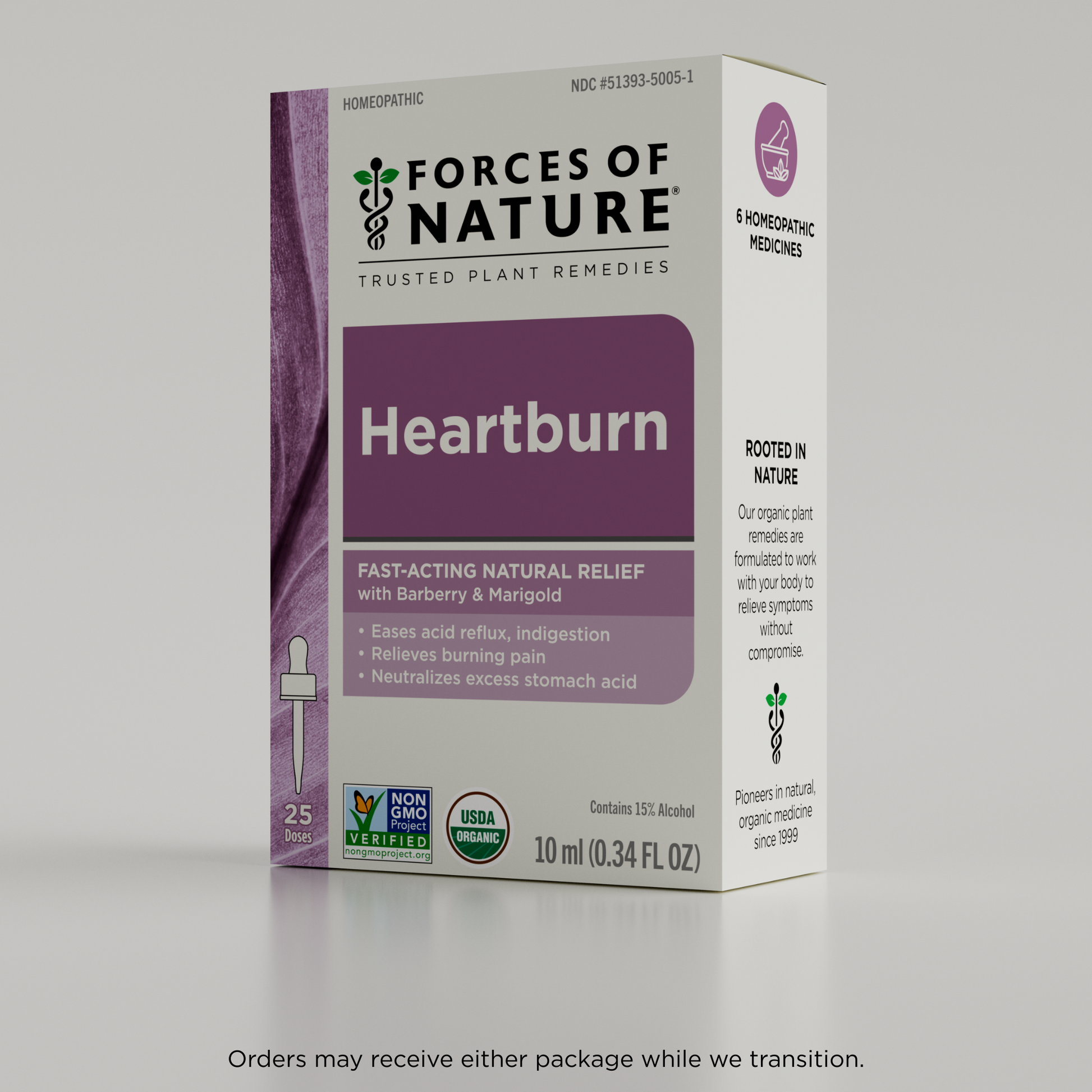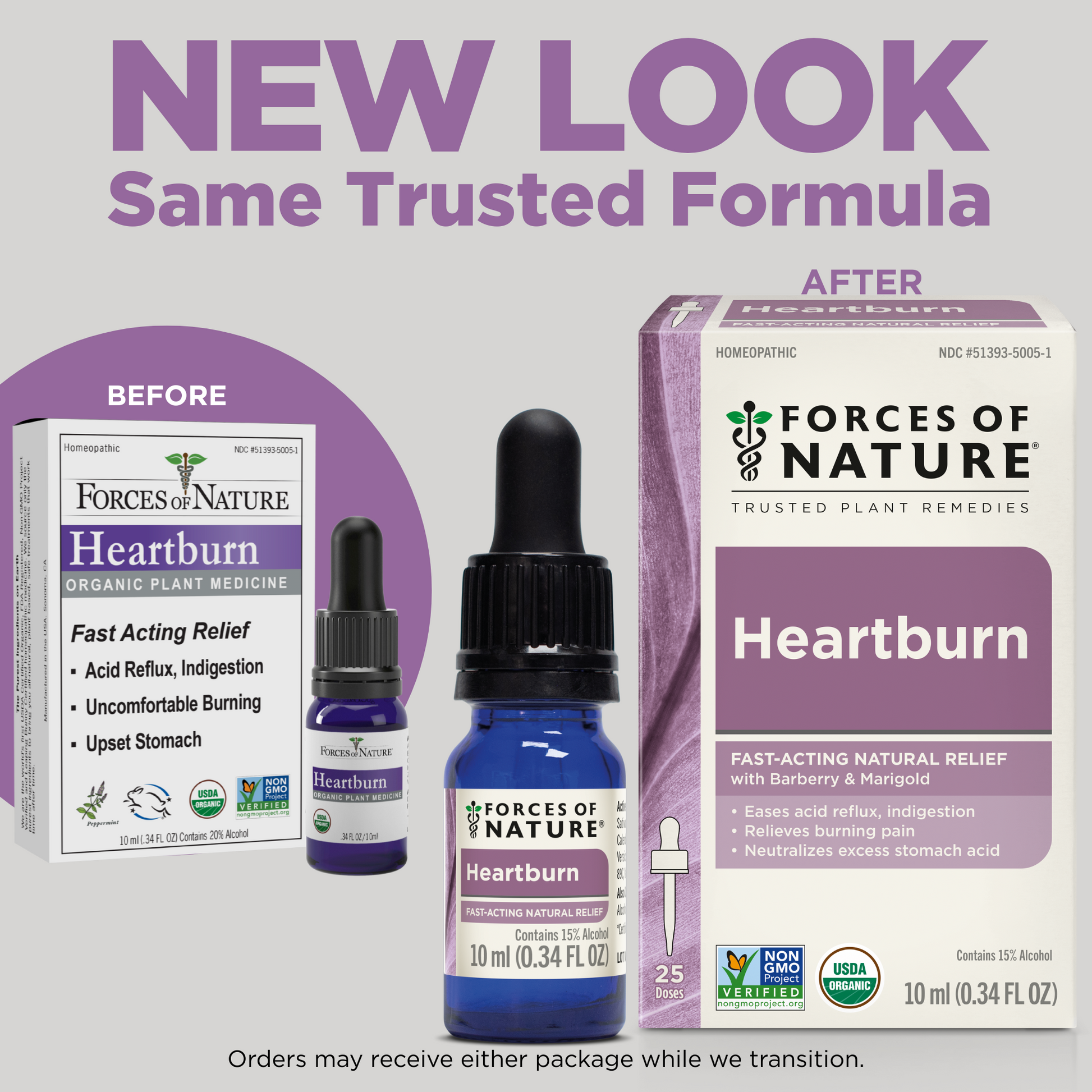 Forces of Nature Heartburn is a fast-acting, all-natural remedy designed to ease burning, indigestion, and acid reflux. This powerful formula combines organic homeopathic medicines, including Berberis Vulgaris (Barberry) known for its natural alkaloids, and Calendula Officinalis (Marigold) with anti-inflammatory properties. Taken as a few drops sublingually for fast absorption, Heartburn naturally soothes irritation and calms digestive discomfort. Unlike conventional antacids or acid blockers that have unwanted side effects or serve only to mask symptoms, this plant-based approach works with your body to restore digestive balance.