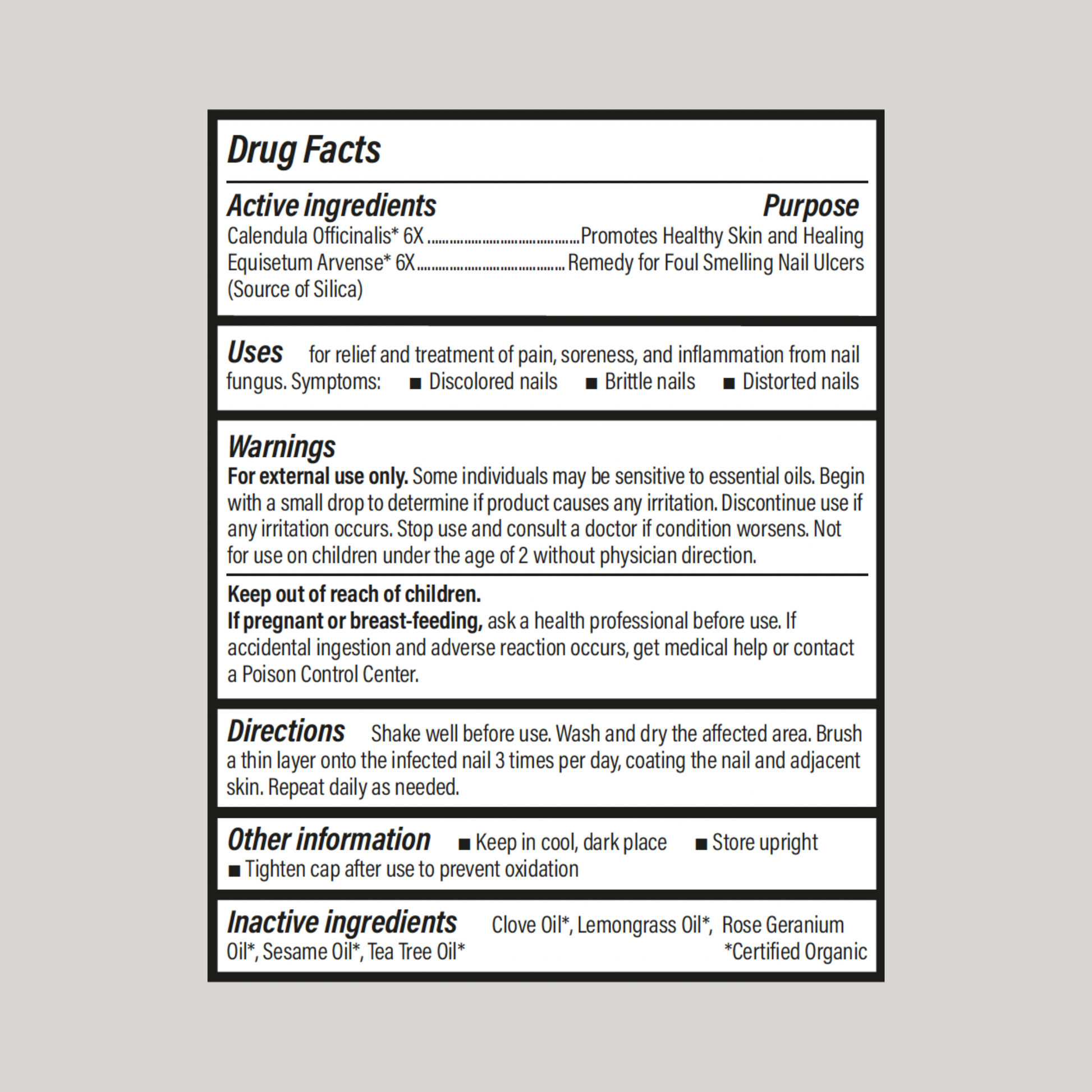 A supportive blend of Organic Tea Tree, Rose Geranium, Lemongrass, and Clove Oils enhances the effectiveness of the homeopathics by helping to soothe and refresh the affected area. These aromatic essential oils work in harmony to nurture nails and surrounding skin, creating a balanced environment that complements the restorative action of the homeopathic ingredients.
