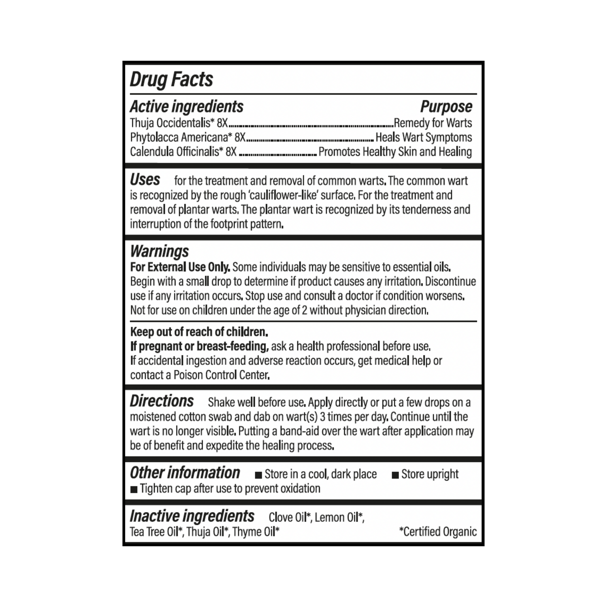 Forces of Nature Wart Control Extra Strength is a powerful, plant-based remedy for use in removing common and plantar warts with consistent use. Formulated with a unique blend of organic homeopathic medicines, including Thuja Occidentalis (Northern White Cedar) known for its naturally occurring antimicrobial phytochemicals that can fight warts and Calendula Officinalis (Marigold) long used to treat localized skin ailments, Wart Control works with your body to naturally fight warts at the root and prompt their elimination. The active ingredients are blended with pure essential oils, including Tea Tree and Thuja, to cleanse and nourish the impacted skin. Unlike conventional wart removal products that use synthetic ingredients or rely on freezing or acids, Wart Control is designed to be gentle on your skin for painless, natural wart treatment.