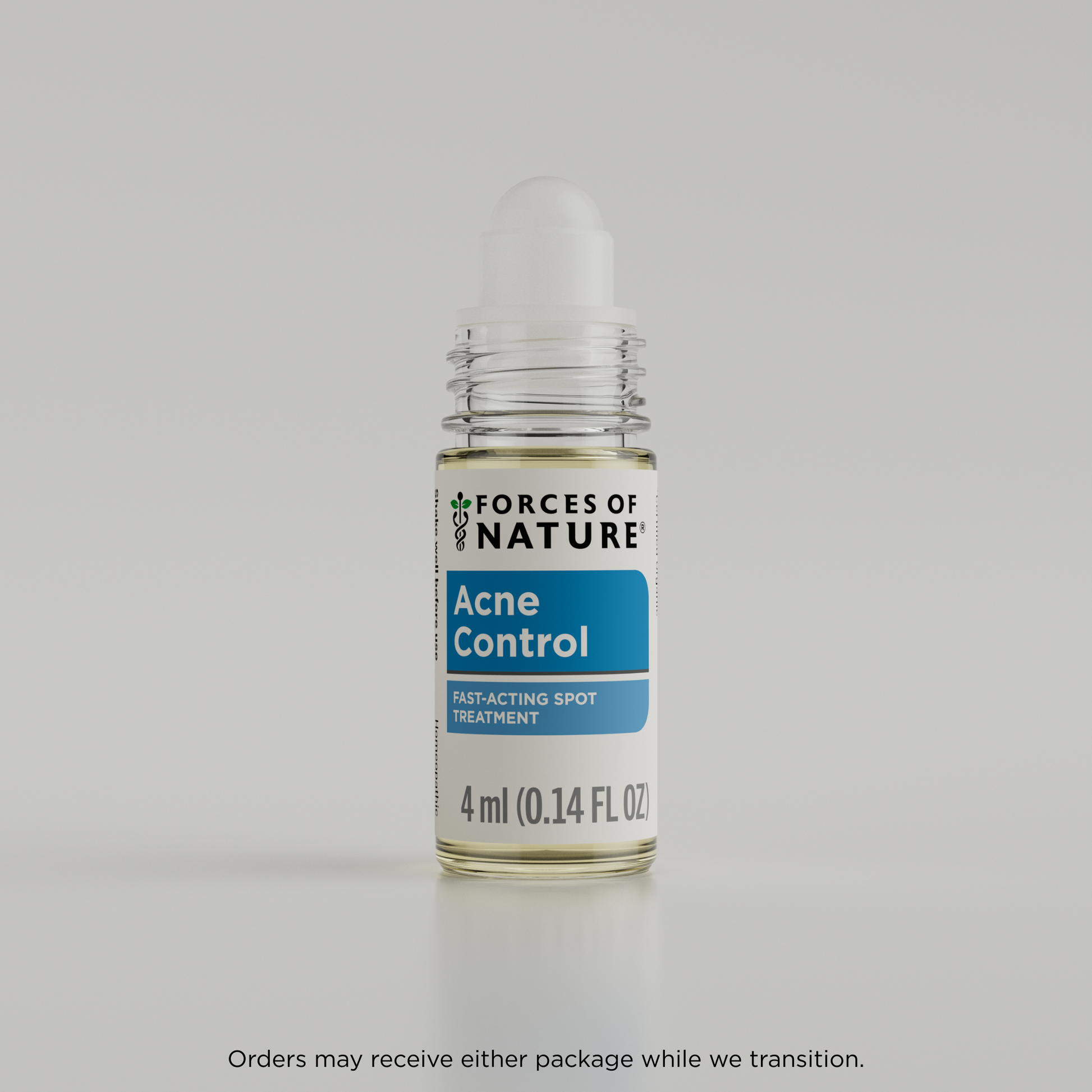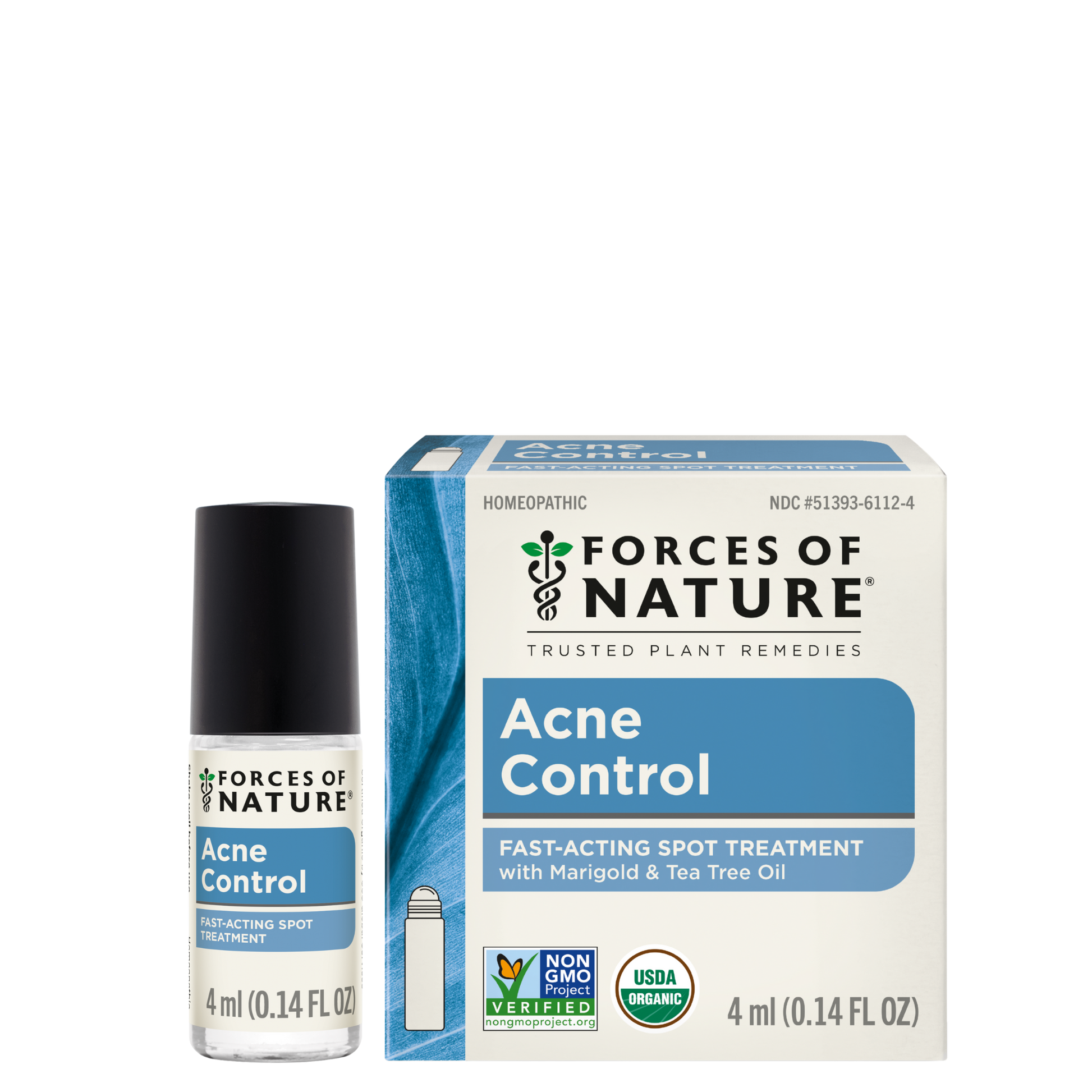 Forces of Nature Acne Control is a powerful remedy to clear breakouts and restore balance to troubled skin. Formulated with a unique blend of organic homeopathic medicines and essential oils, including Calendula Officinalis (Marigold) and Tea Tree, this formula absorbs into the skin to target pimples, blackheads, and whiteheads at the root while calming redness and swelling. Pure essential oils, like Rose Geranium, nourish irritated skin. Tough on blemishes but gentle on your body, it works to reduce inflammation, shrink zits, and support your skin’s natural healing process without the dryness, peeling, or harsh side effects that can be caused by synthetic chemical-based treatments.