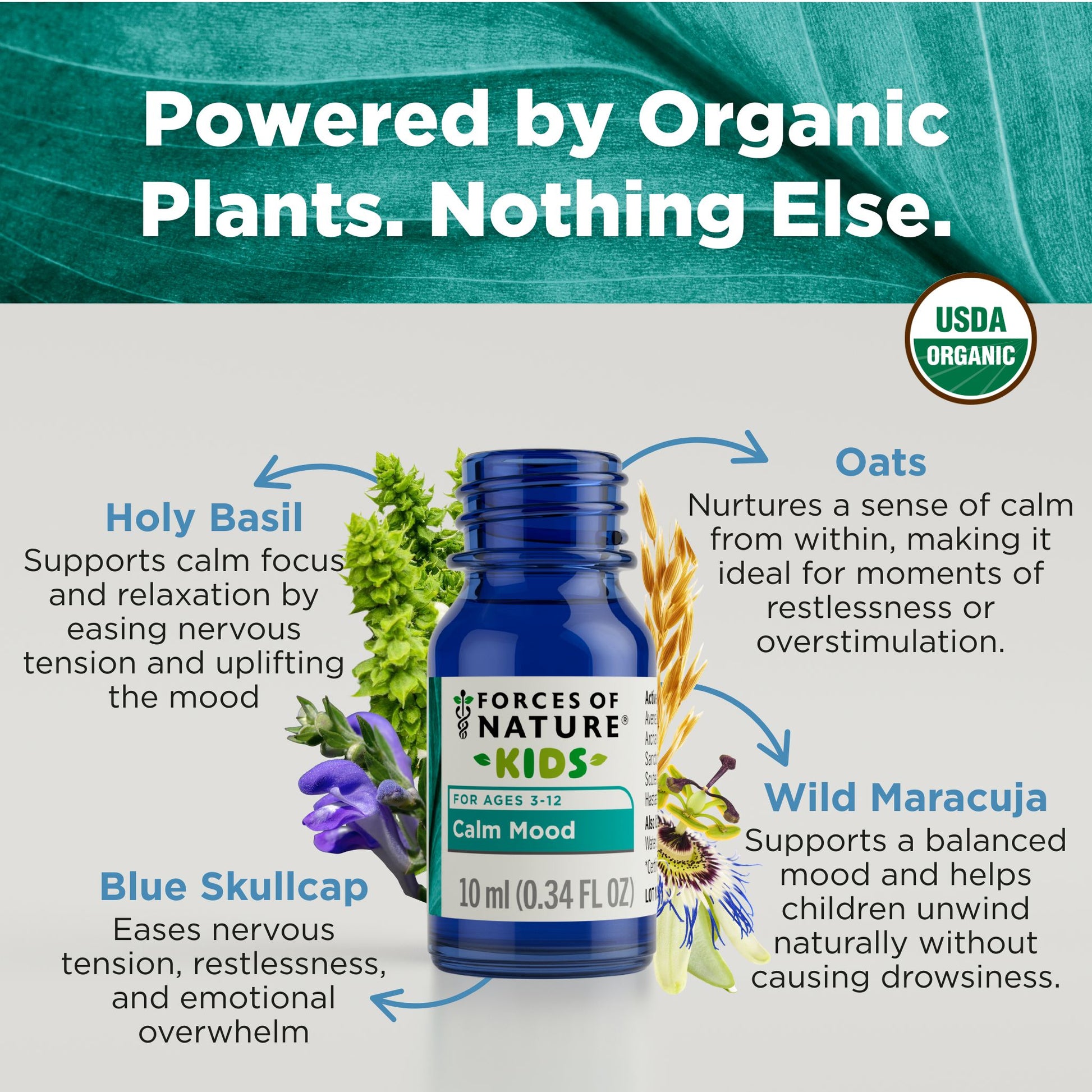 Forces of Nature Calm Mood Kids is a plant-based, non-drowsy remedy crafted to naturally ease stress, irritability, and restlessness in children. A blend of organic homeopathic medicines, including Avena Sativa (Oat), Angelica Archangelica (Angelica), and Ocimum Sanctum (Holy Basil) bring natural properties to help soothe anxious feelings, promote relaxation, and restore a sense of ease. Unlike conventional over-the-counter products that may rely on synthetic chemicals or harsh ingredients, this formula uses the gentle power of plant-based ingredients to calm the nervous system and support emotional balance. Glycerin (USP) provides a natural sweetness.