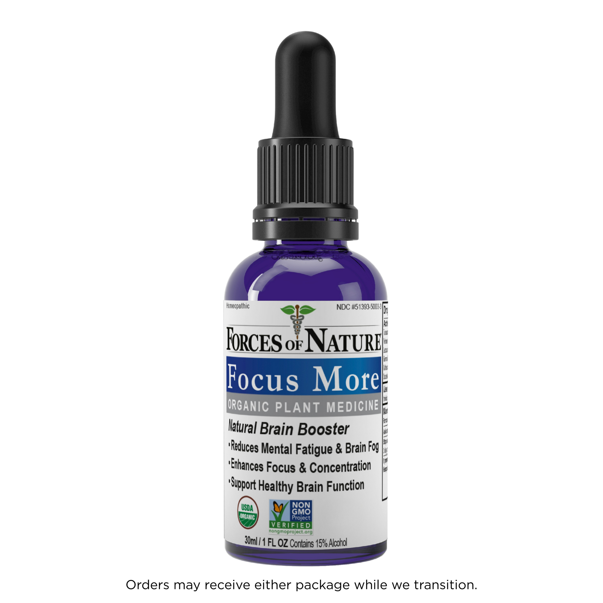 Forces of Nature Focus More acts to support sharper thinking, alertness, and productivity the natural way. This unique formula blends certified organic homeopathic medicines to help improve concentration, support memory, and ease mental fatigue without the jitters or crashes that come with conventional stimulants. Active ingredients like Taraxacum Officinale (Dandelion) with its antioxidants and vital compounds for mental clarity, Verbena Hastata (Verbena), and Lactuca Virosa (Wild Lettuce) to calm the nervous system for improved focus, are thoughtfully blended to promote balanced focus, calm energy, and clear thinking. Differently than common over-the-counter focus remedies that contain synthetic stimulants, or harsh chemicals that can be tough on your stomach, Focus More is a clean, plant-based medicine, gentle, and non-habit forming. Designed to be used as needed daily.