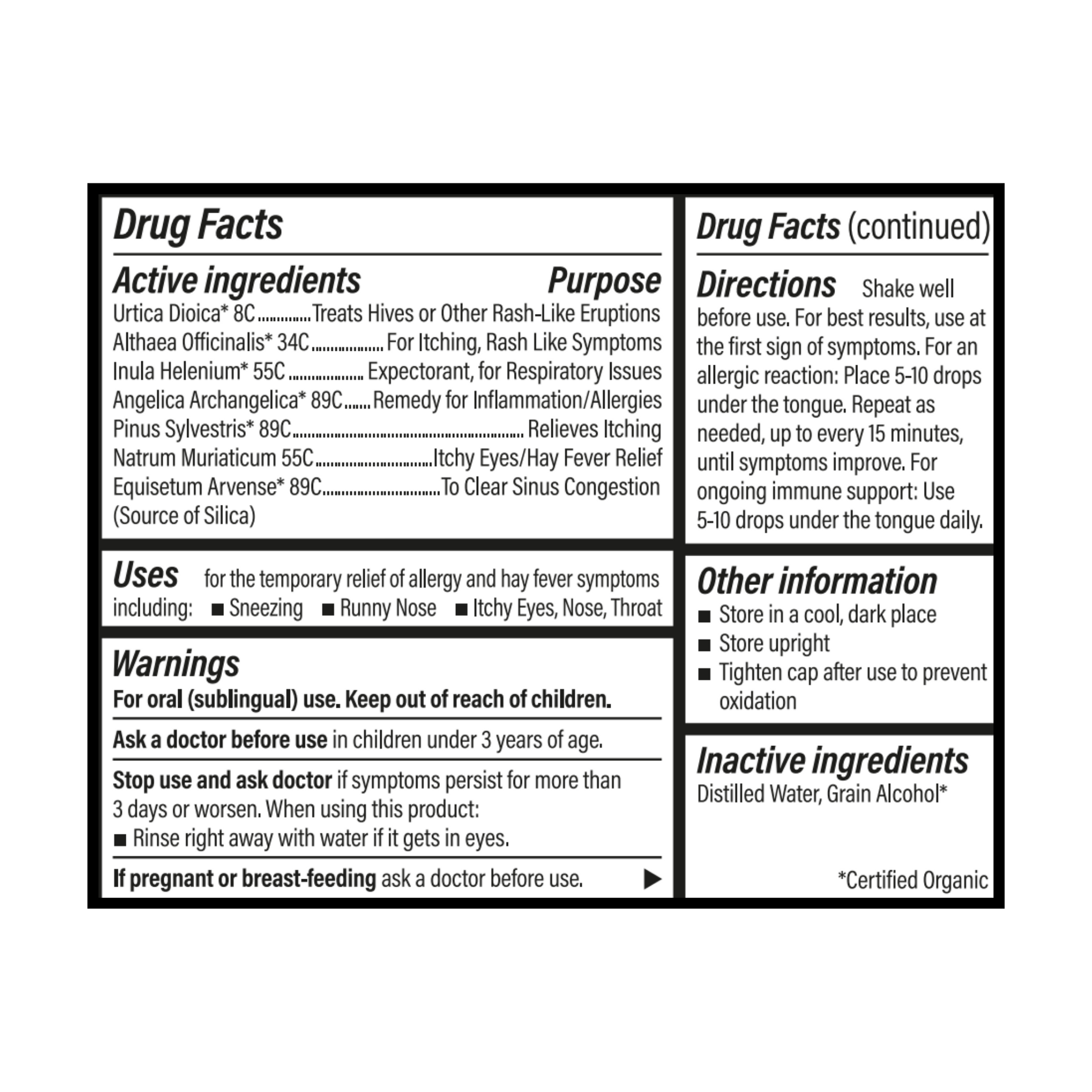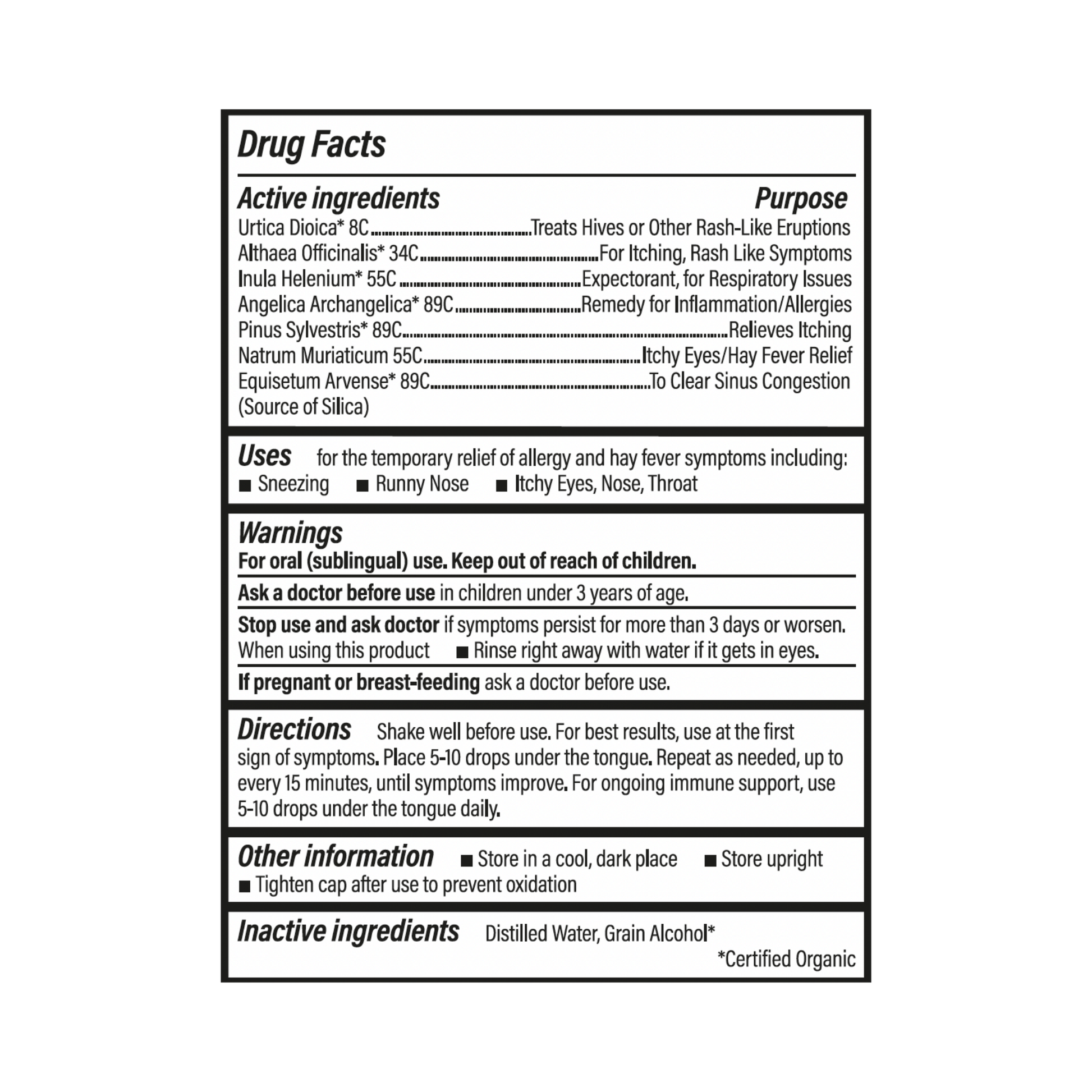 Certified Organic, Non-GMO Project Verified, and cruelty free, Allergy Maximum Strength sets a higher standard for clean medicine. Gentle yet effective, it is free from harsh chemicals, dyes, or other artificial additives for non-drowsy relief you can use daily as needed.