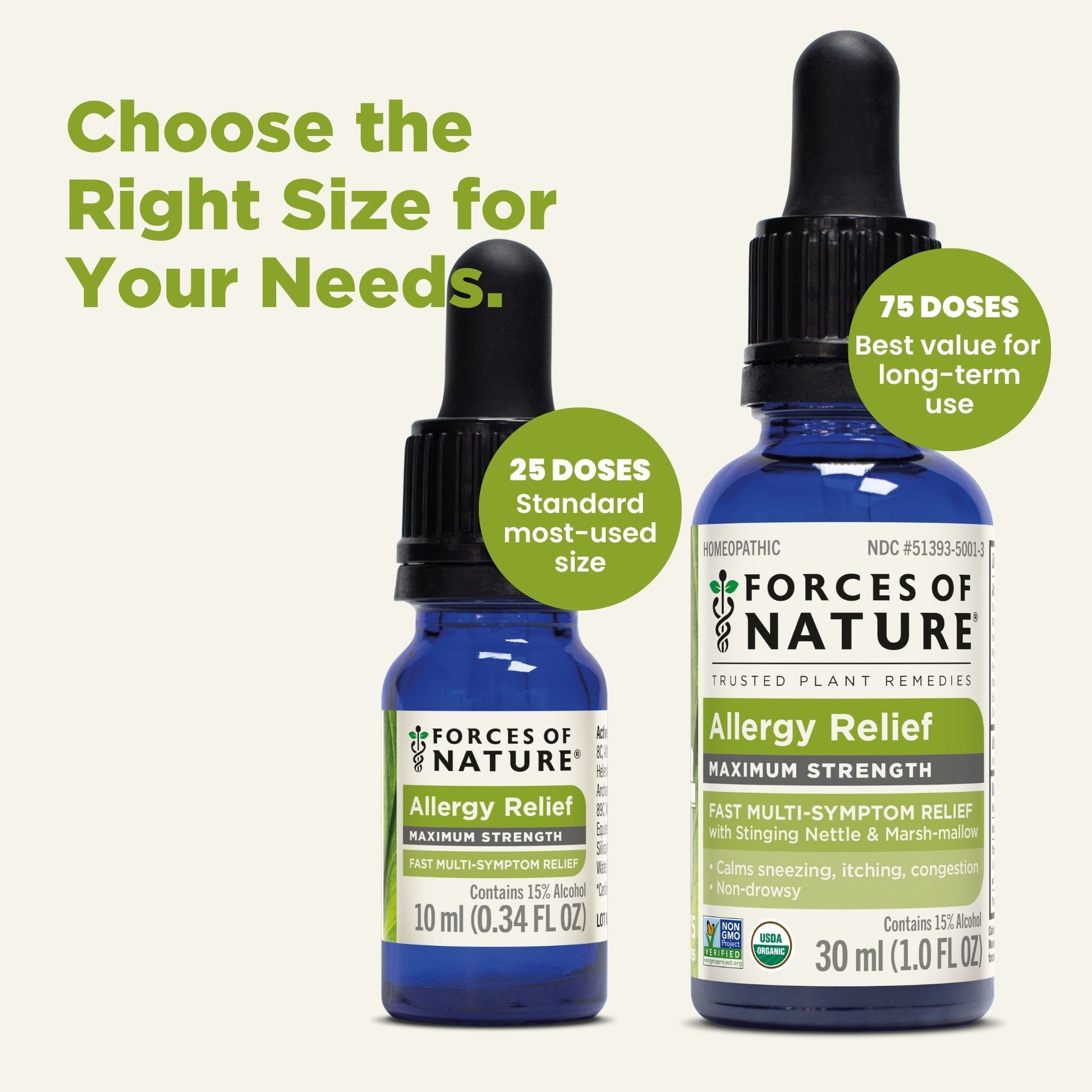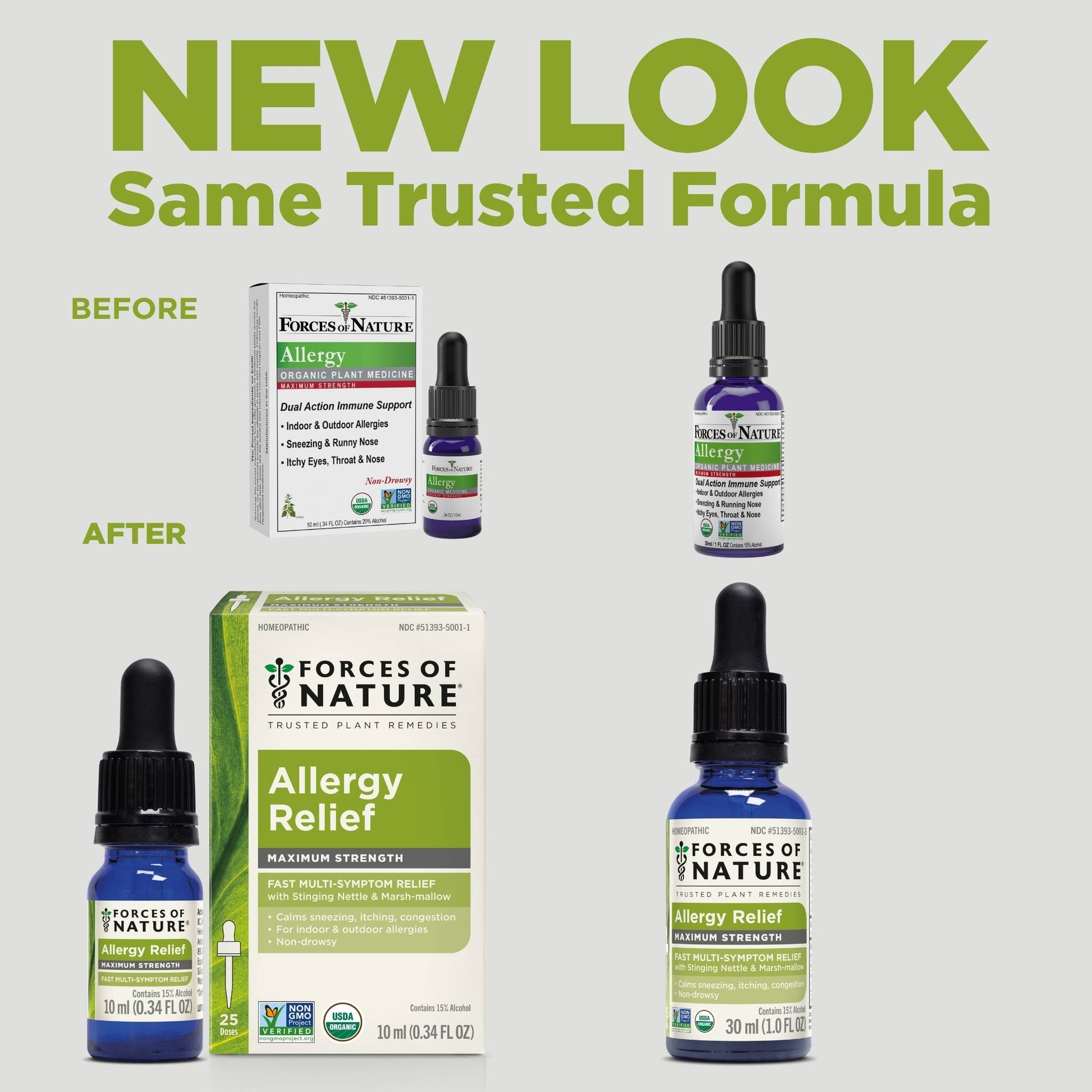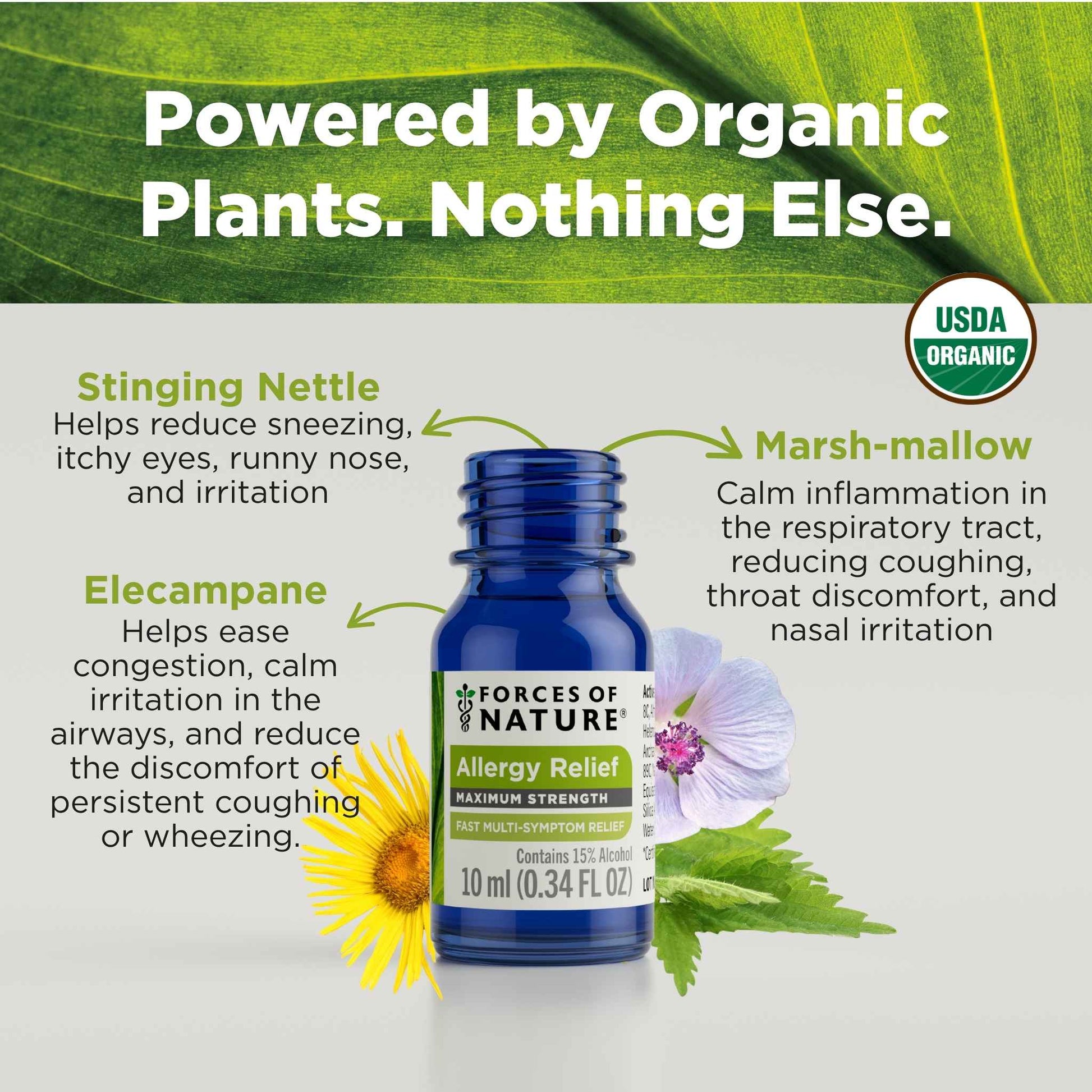 Forces of Nature Allergy Maximum Strength is an all-natural remedy designed to bring fast, effective relief from sneezing, runny nose, itchy eyes, and congestion. Formulated with a unique blend of organic homeopathic medicines, including Urtica Dioica (Stinging Nettle) and Althaea Officinalis (Marsh-mallow), that work to calm inflammation and are known to calm allergic reactions, reducing histamine-like responses. This natural product uses plant-based ingredients as compared to conventional OTC allergy medicines with synthetic chemicals that can cause drowsiness, dry mouth, or other unwanted side effects.