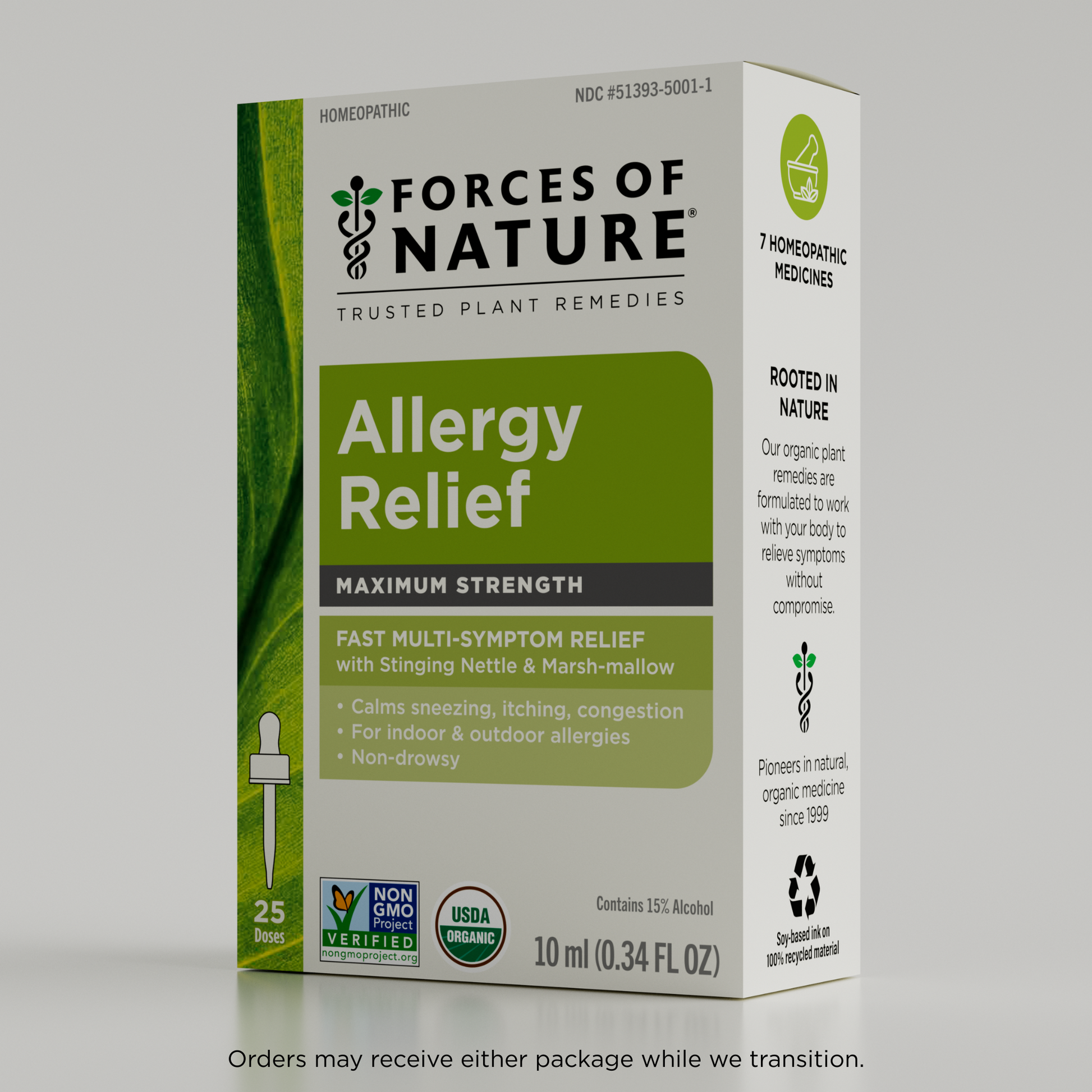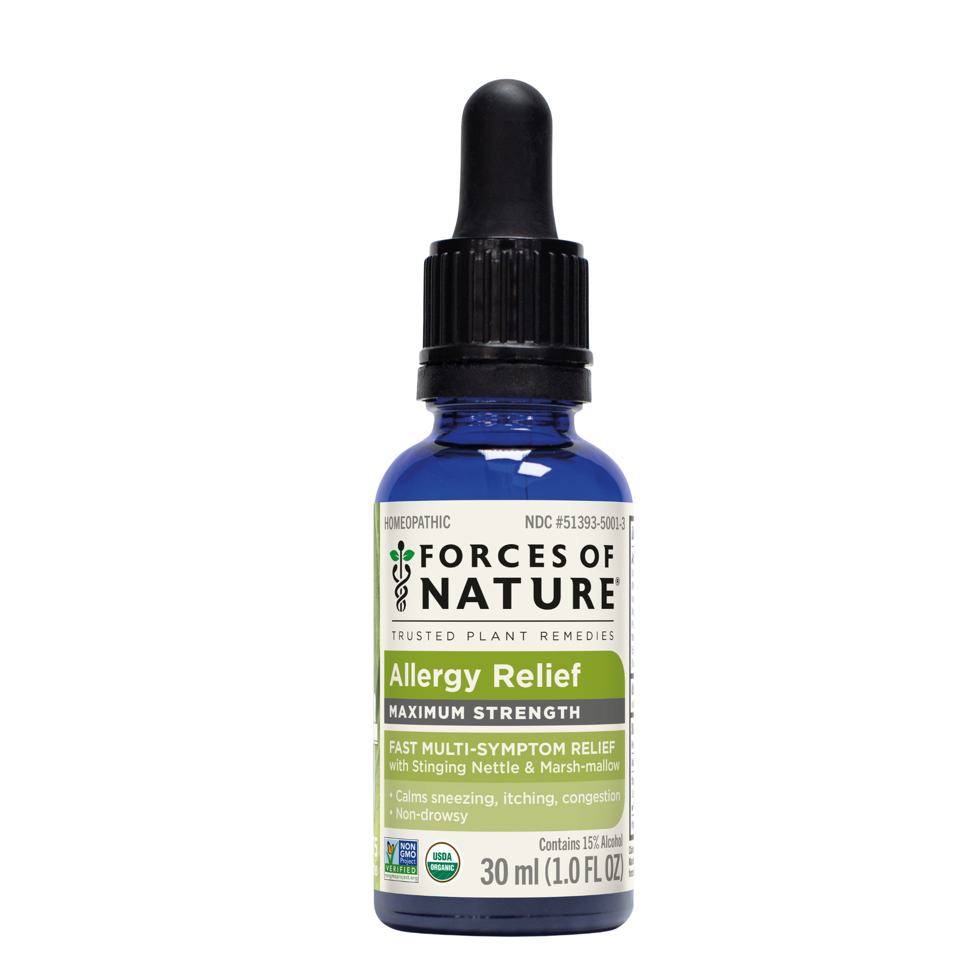 Forces of Nature Allergy Maximum Strength is an all-natural remedy designed to bring fast, effective relief from sneezing, runny nose, itchy eyes, and congestion. Formulated with a unique blend of organic homeopathic medicines, including Urtica Dioica (Stinging Nettle) and Althaea Officinalis (Marsh-mallow), that work to calm inflammation and are known to calm allergic reactions, reducing histamine-like responses. This natural product uses plant-based ingredients as compared to conventional OTC allergy medicines with synthetic chemicals that can cause drowsiness, dry mouth, or other unwanted side effects.