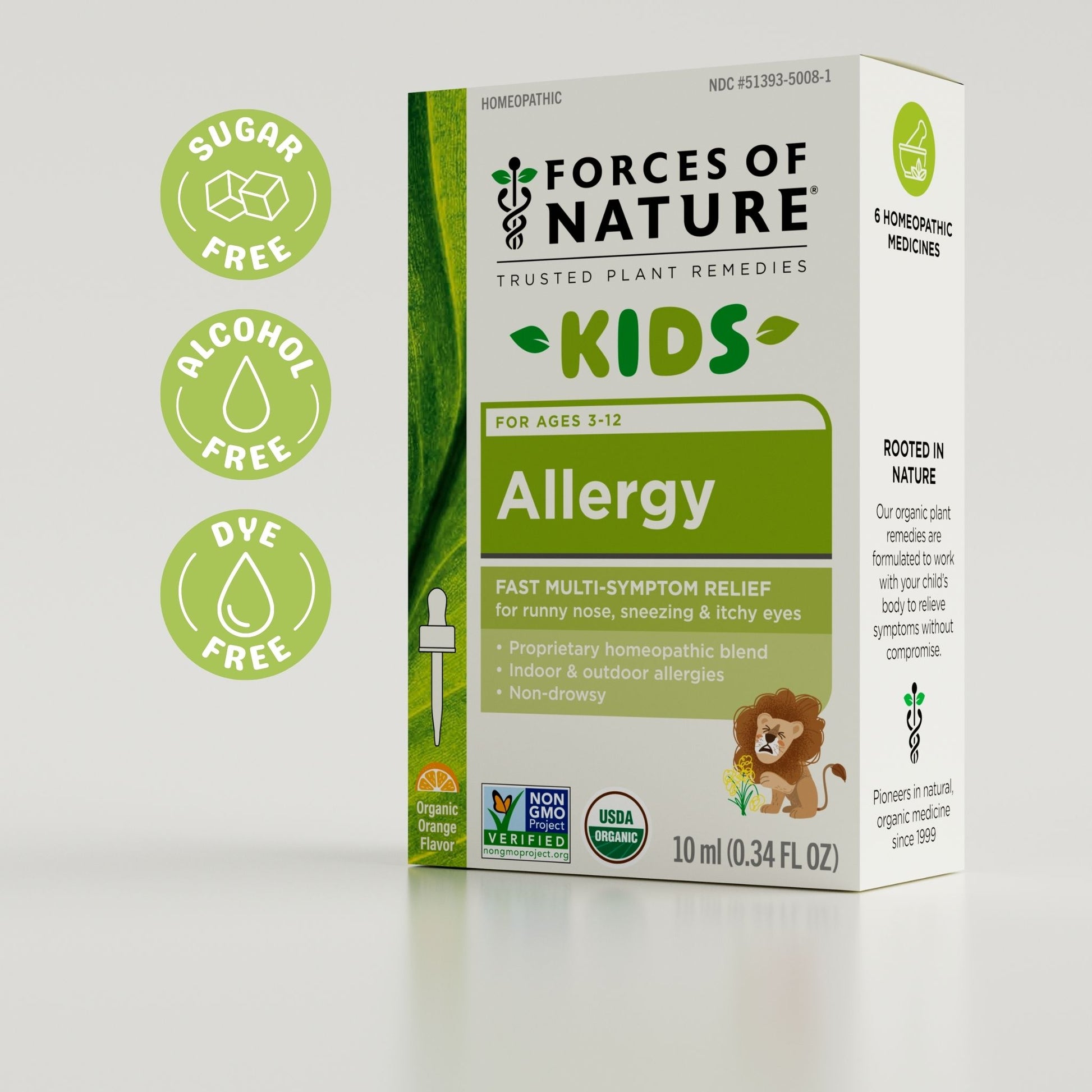 Forces of Nature Allergy Kids is a gentle, yet effective solution to relieve bothersome allergy symptoms like sneezing, runny nose, itchy eyes, and congestion. Allergy Kids is formulated with a unique blend of organic homeopathic medicines at lower potencies designed for young bodies. Active ingredients include Urtica Dioica (Stinging Nettle) and Althaea Officinalis (Marsh-mallow) that work to calm inflammation and are known to calm allergic reactions, reducing histamine-like responses.