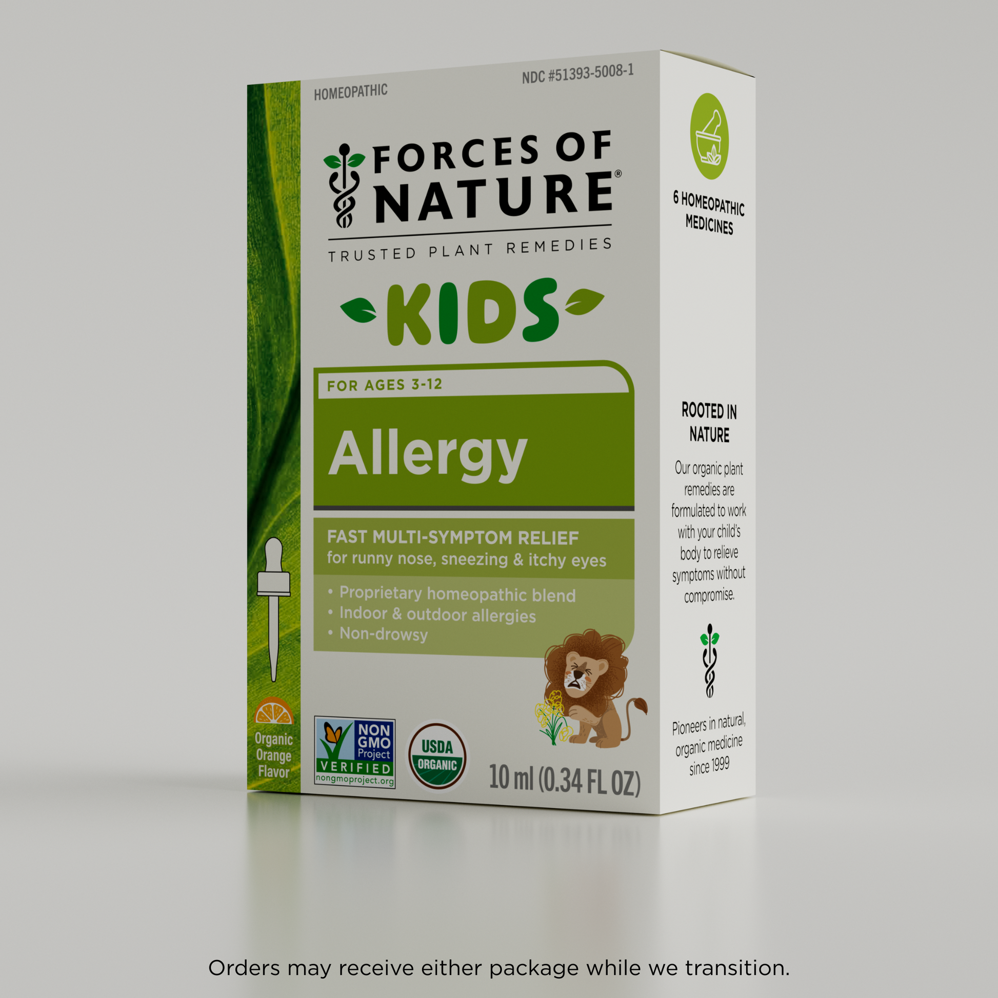 Forces of Nature Allergy Kids is a gentle, yet effective solution to relieve bothersome allergy symptoms like sneezing, runny nose, itchy eyes, and congestion. Allergy Kids is formulated with a unique blend of organic homeopathic medicines at lower potencies designed for young bodies. Active ingredients include Urtica Dioica (Stinging Nettle) and Althaea Officinalis (Marsh-mallow) that work to calm inflammation and are known to calm allergic reactions, reducing histamine-like responses.