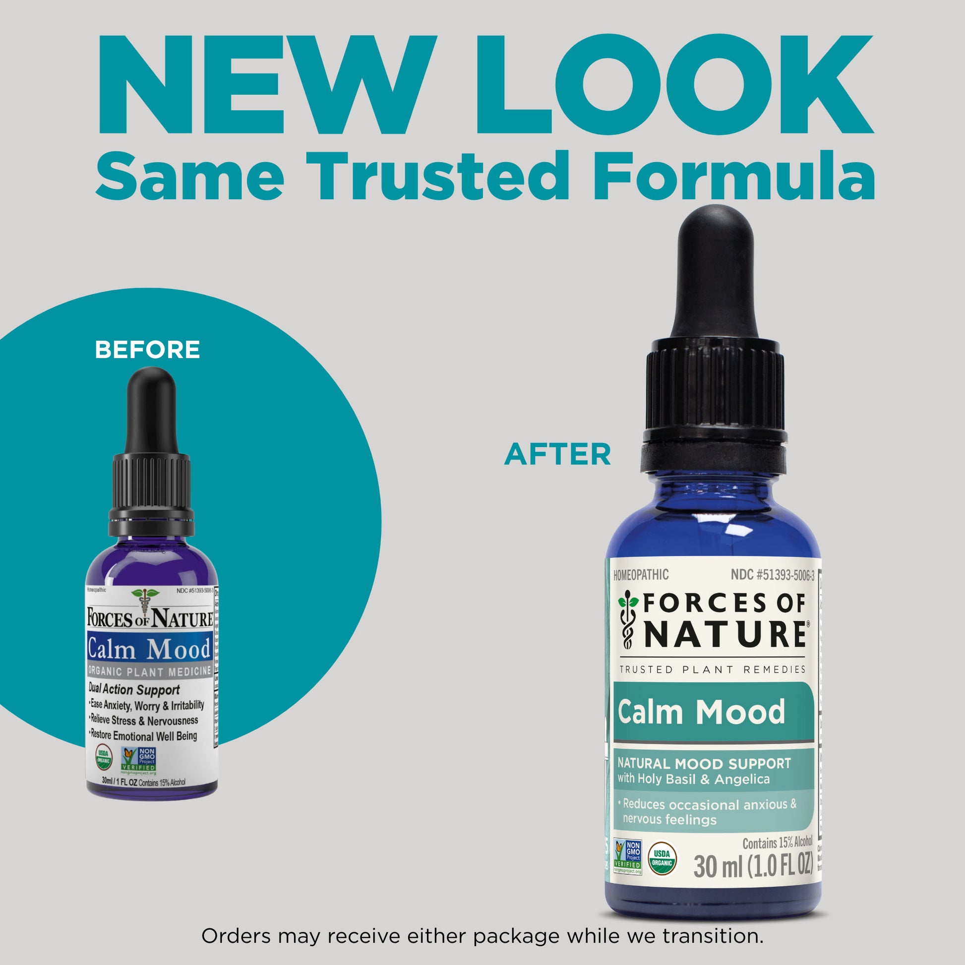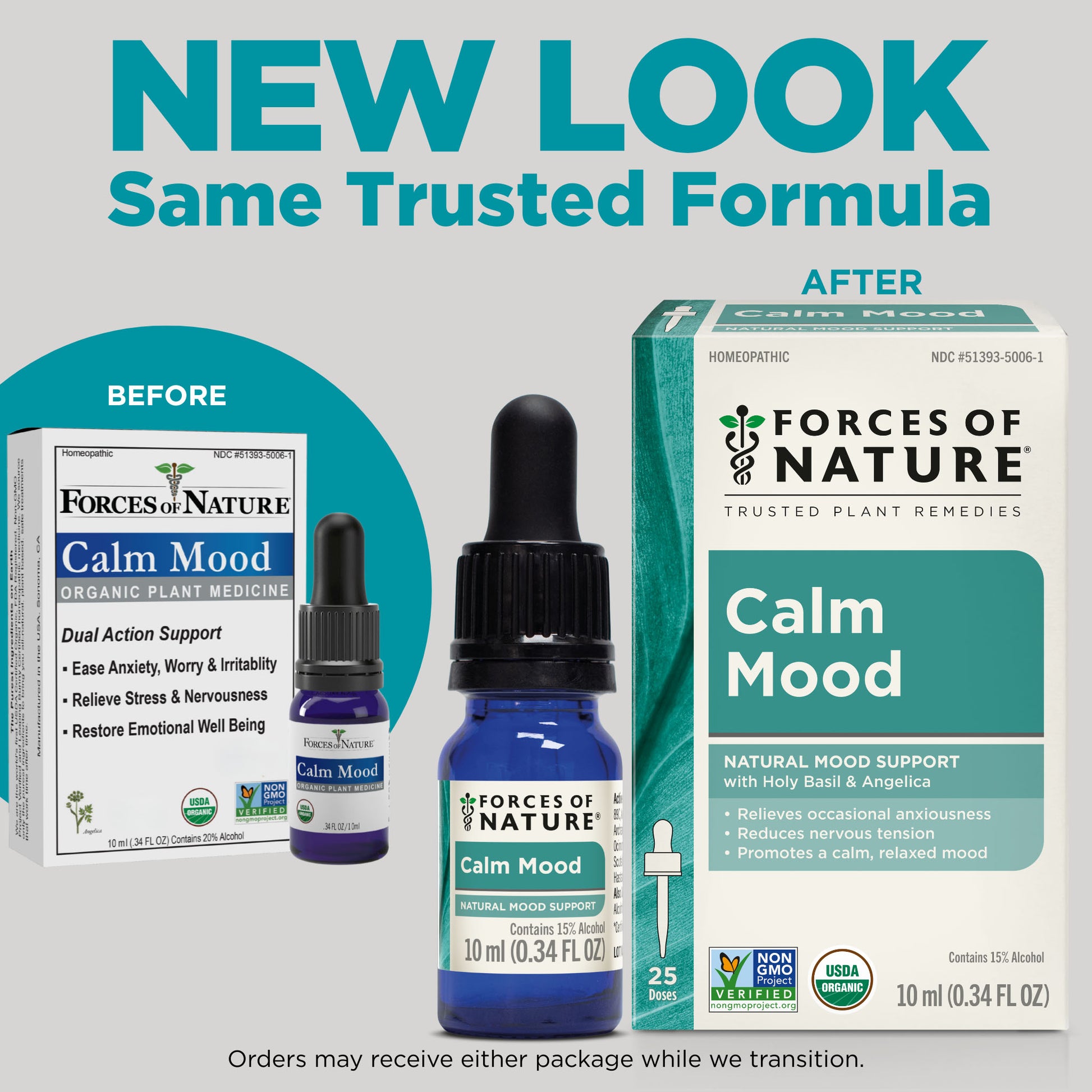 Forces of Nature Calm Mood is a powerful, plant-based remedy designed to naturally ease stress, anxious thoughts, and nervous tension. Featuring certified organic actives such as Avena Sativa (Oat) known for its ability to soothe the nervous system, Ocimum Sanctum (Holy Basil) to restore balance, and Angelica Archangelica (Angelica) to promote relaxation, this formula works in harmony with your body to help you feel calmer and more centered throughout the day. Unlike synthetic stress relief products that may cause drowsiness or dependency, all natural Calm Mood is non-habit-forming, gentle, and safe for daily use.