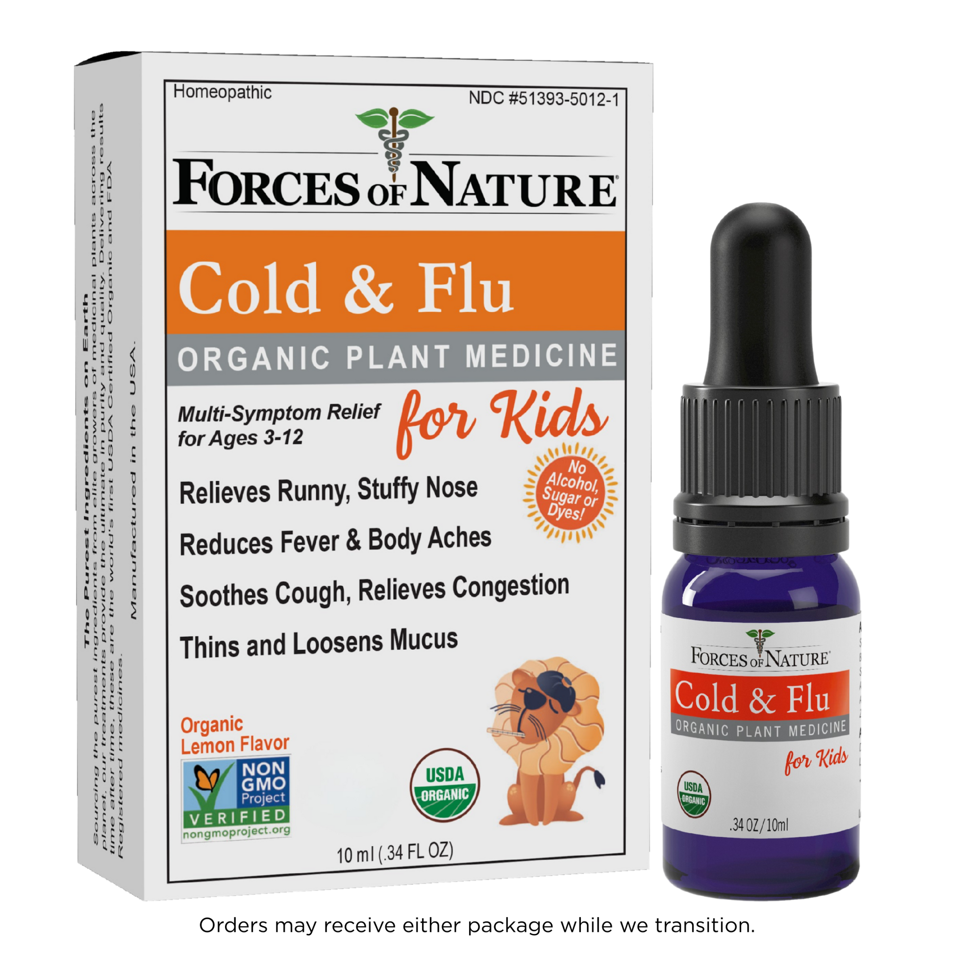 Forces of Nature Cold & Flu Kids is designed for fast-acting relief of congestion, cough, sore throat, fatigue, and body aches. Powered by a blend of certified organic homeopathic ingredients including Sambucus Nigra (Elderberry) and Berberis Vulgaris (Barberry), both packed with antioxidants and known for their ability to support the immune system, this formula helps your child bounce back faster. Cold & Flu Maximum Strength is designed specifically for children with less potent homeopathics. It works to fight symptoms and support immune response without the synthetic ingredients found in conventional products that can cause drowsiness, cotton mouth or other unwanted side effects. Lemon oil and glycerin (USP) provide a natural sweetness that make taking this medicine easy.