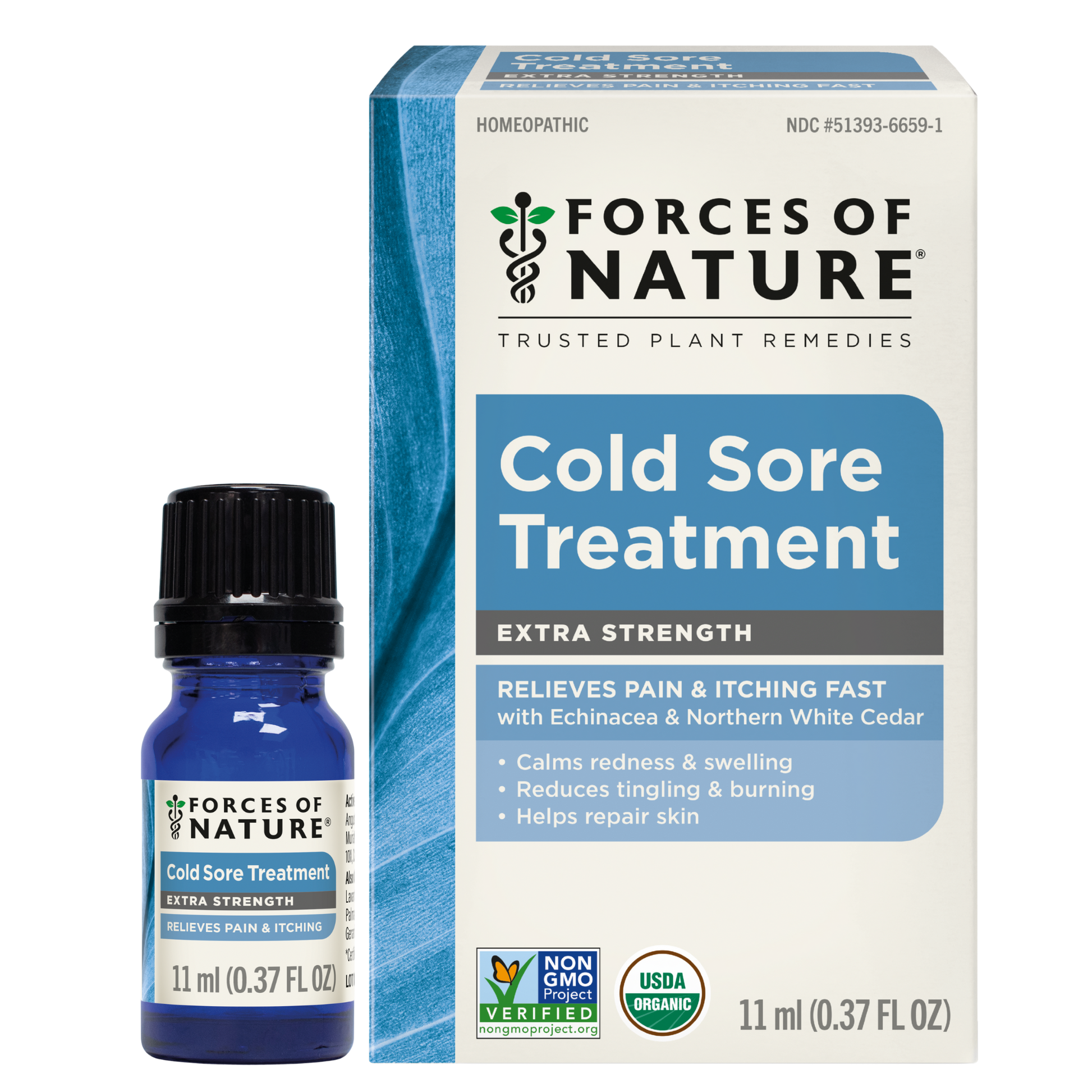 Forces of Nature Cold Sore Treatment Extra Strength (formerly H-Balm) is one of our heritage products and has been a favorite for over 15 years because of the excellent natural relief it delivers. It is a powerful remedy that acts fast to relieve cold sore symptoms. Cold sores, or fever blisters, are a symptom of a viral outbreak, often related to HSV-1 (most commonly) or HSV-2. Cold Sore Treatment Extra Strength is formulated with a targeted blend of organic homeopathic medicines, including Echinacea Angustifolia (Echinacea), known for its antiviral and wound healing properties, and Thuja Occidentalis (Northern White Cedar), regarded for its natural support for the immune system. Pure essential oils, including Eucalyptus and Tea Tree, serve to cleanse and soothe the skin. Differently than conventional cold sore treatments that rely on harsh chemicals and synthetic additives, this all-natural formula uses the power of plants to calm irritation, ease discomfort, and support the body’s healing process.