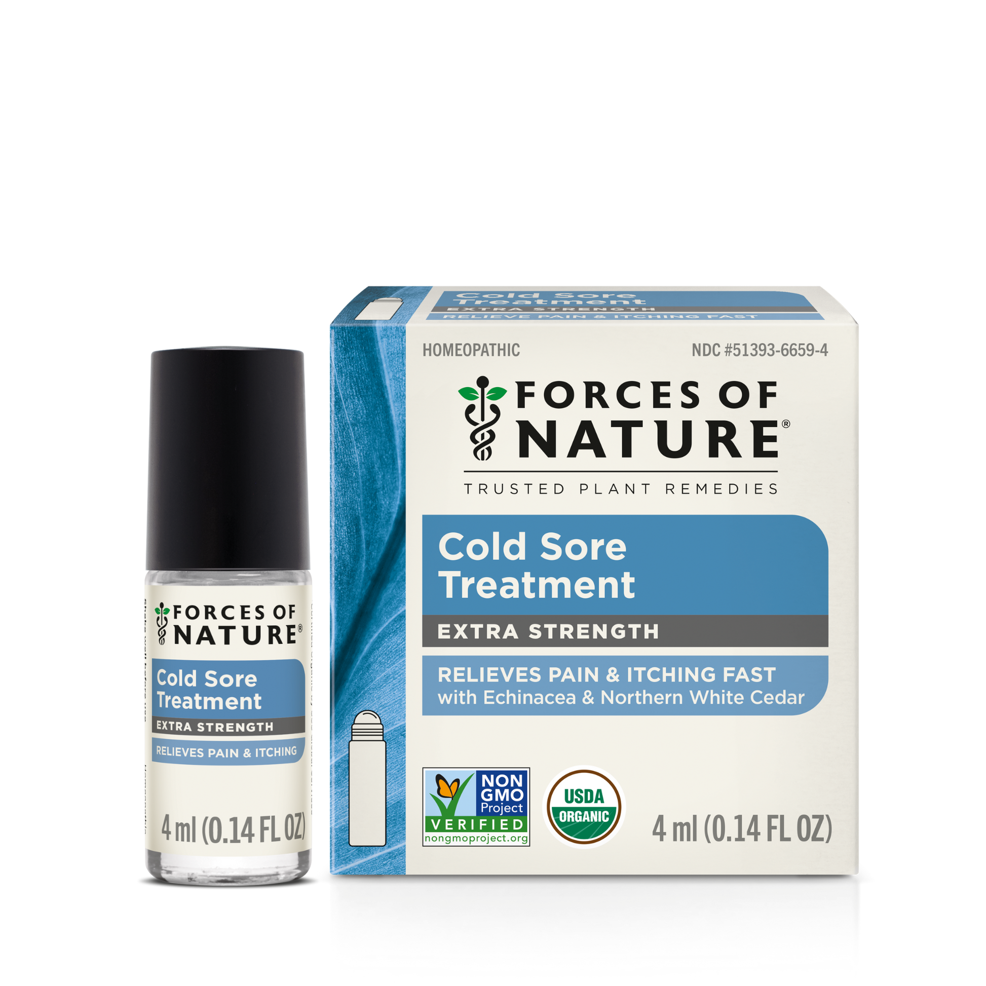 Forces of Nature Cold Sore Treatment Extra Strength (formerly H-Balm) is one of our heritage products and has been a favorite for over 15 years because of the excellent natural relief if delivers. It is a powerful remedy that acts fast to relieve cold sore symptoms. Cold sores, or fever blisters, are a symptom of a viral outbreak, often related to HSV-1 (most commonly) or HSV-2. Cold Sore Treatment Extra Strength is formulated with a targeted blend of organic homeopathic medicines, including Echinacea Angustifolia (Echinacea), known for its antiviral and wound healing properties, and Thuja Occidentalis (Northern White Cedar), regarded for its natural support for the immune system. Pure essential oils, including Eucalyptus and Tea Tree, serve to cleanse and soothe the skin. Differently than conventional cold sore treatments that rely on harsh chemicals and synthetic additives, this all-natural formula uses the power of plants to calm irritation, ease discomfort, and support the body’s healing process.