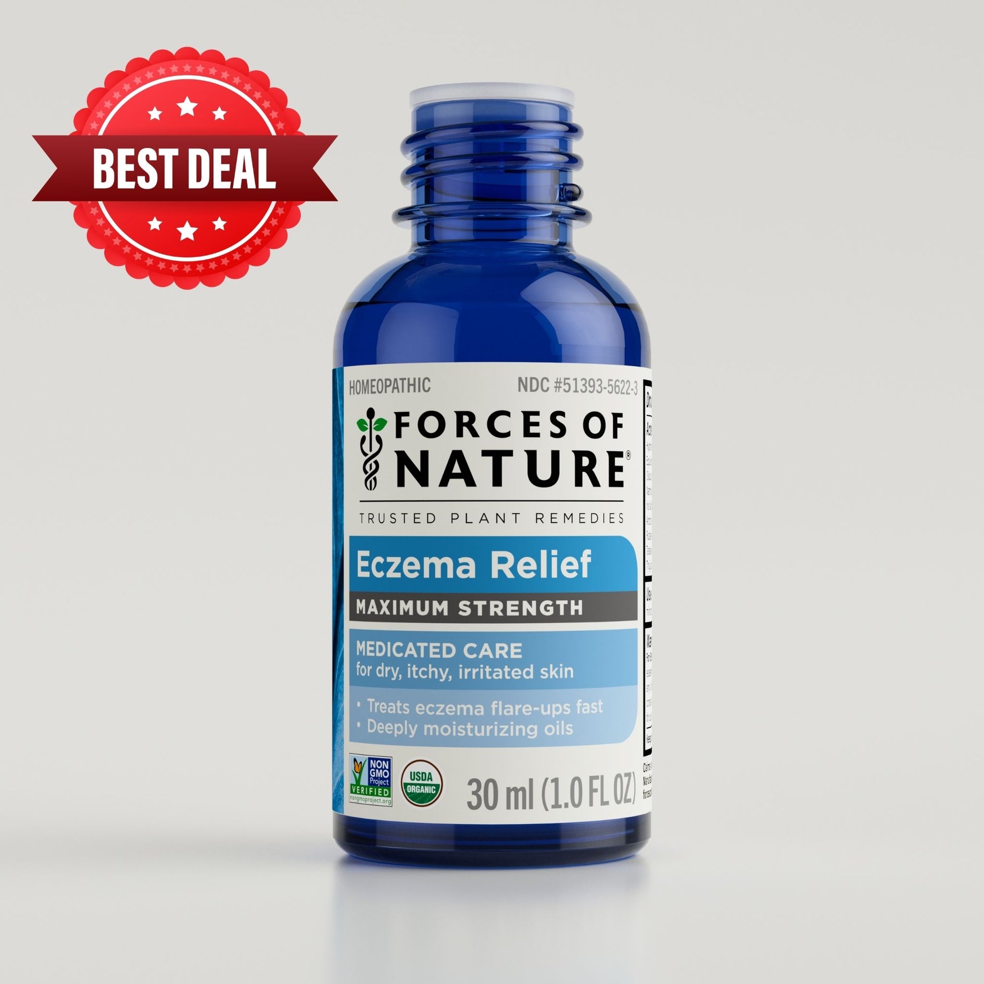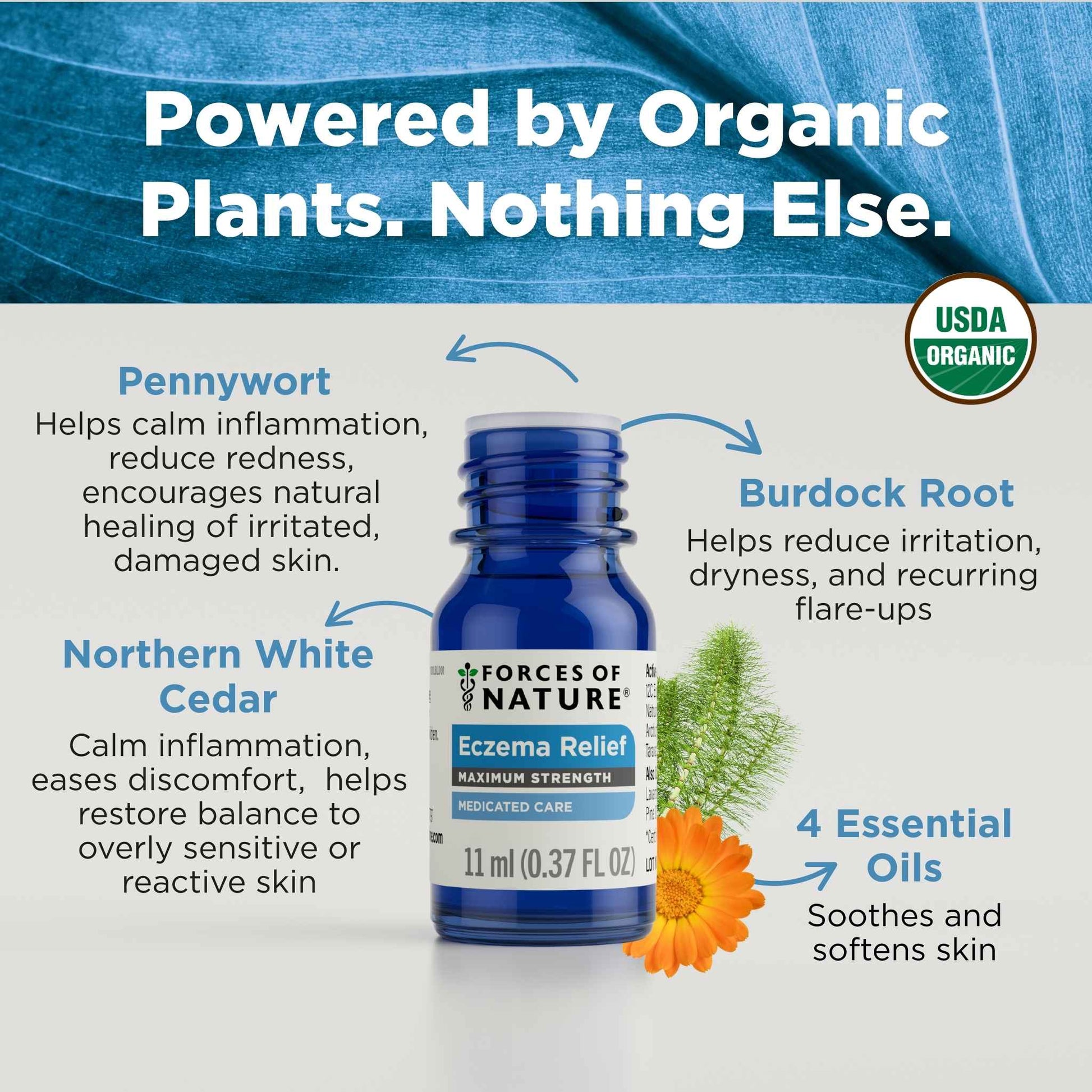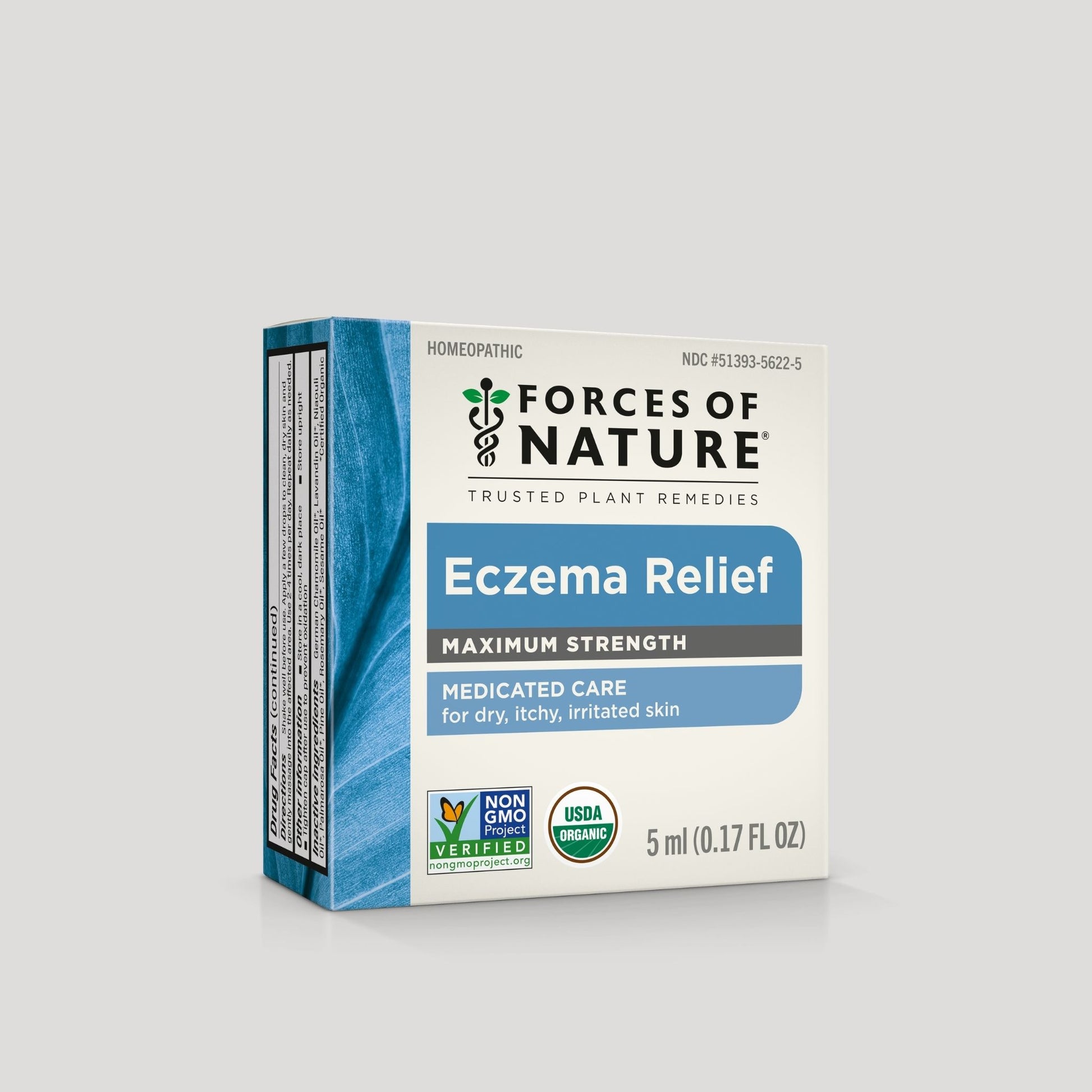 Forces of Nature Eczema Relief Maximum Strength is a natural medicine designed to relieve itching, redness, and irritation from eczema and chronic dry skin. Formulated with certified organic homeopathic ingredients, including Hydrocotyle Asiatica (Pennywort) for its ability to calm irritated skin, Arctium Lappa (Burdock Root) and Taraxacum Officinale (Dandelion) for their anti-inflammatory properties, this eczema treatment provides calming relief. Eczema Control is uniquely blended with pure essential oils, including Niaouli and German Chamomile, to moisturize and soothe skin. Unlike conventional OTC creams with steroids or chemical-heavy fillers, this light, plant-based formula is gentle for daily use, even on sensitive skin.