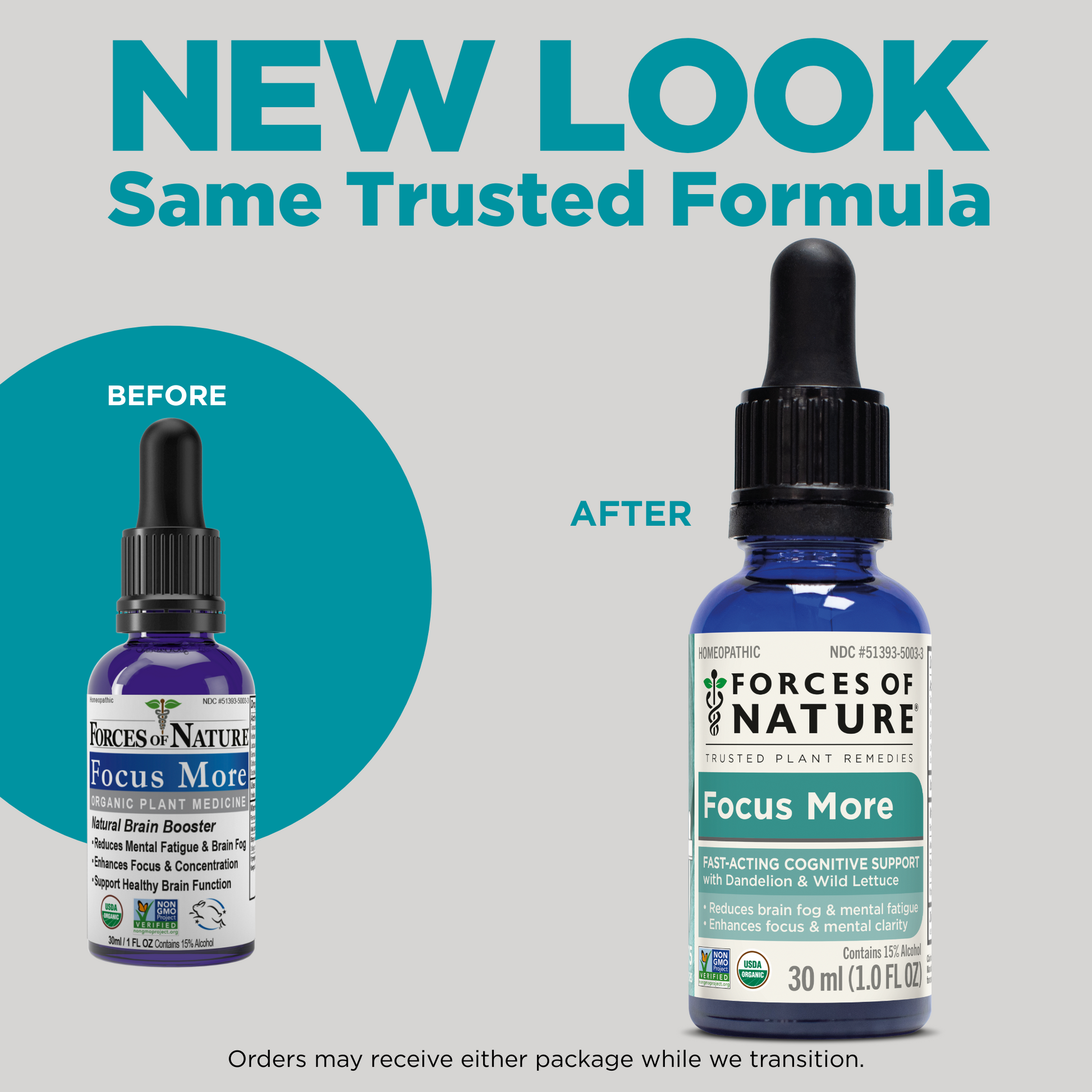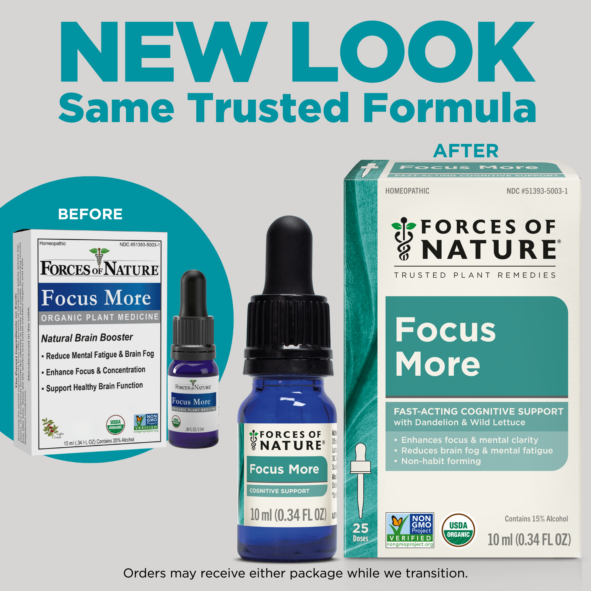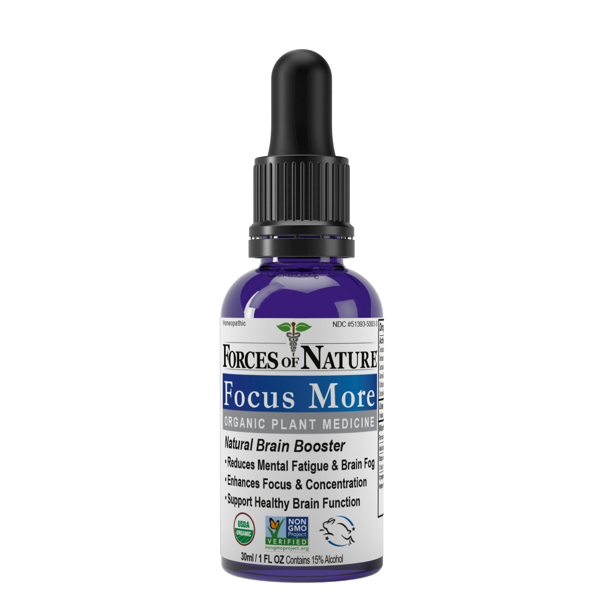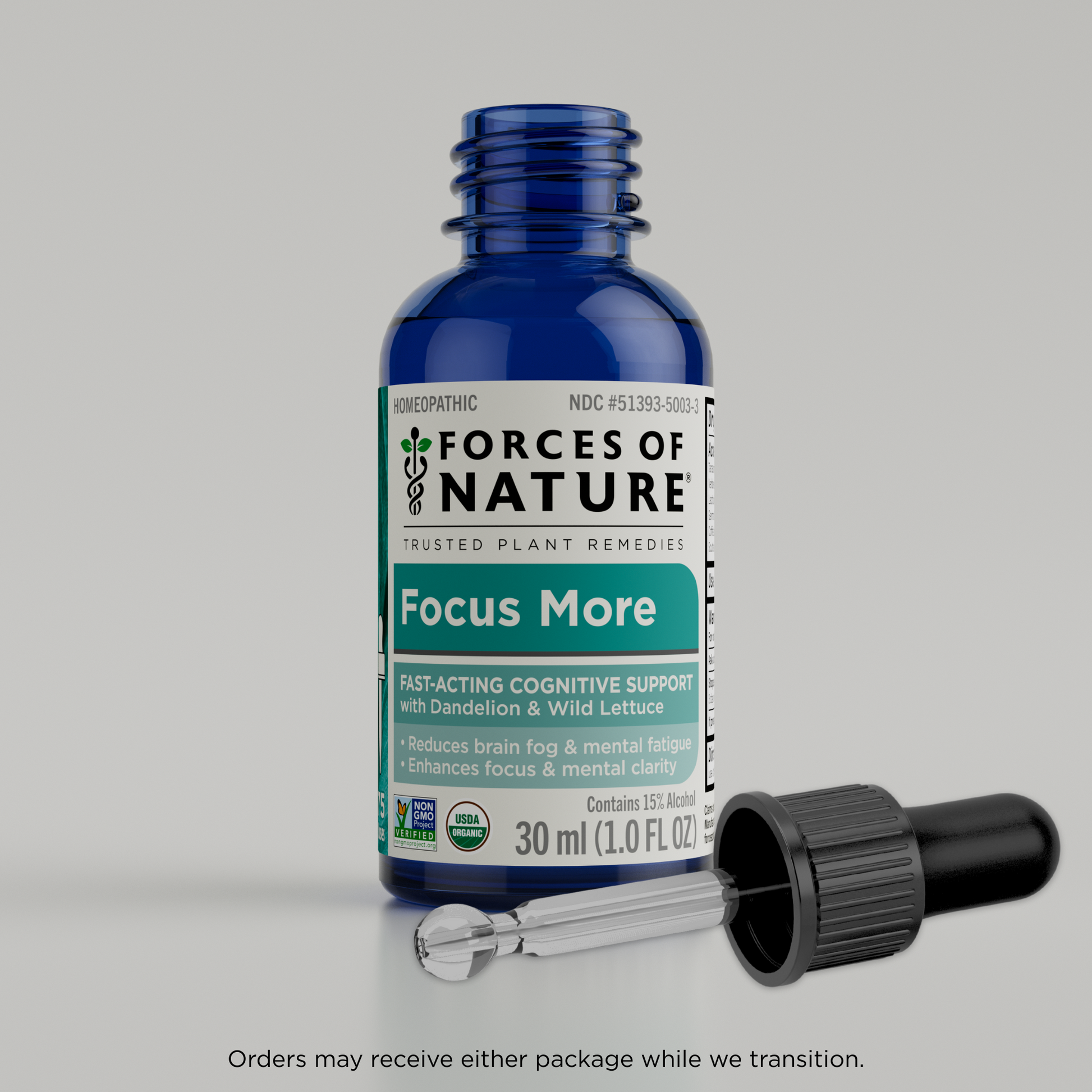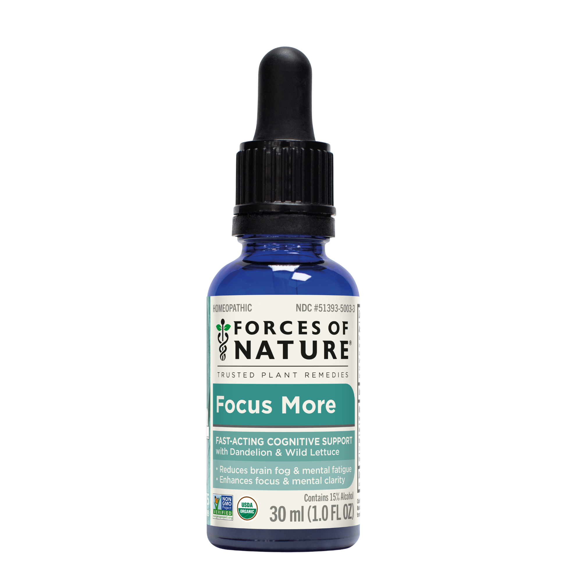Forces of Nature Focus More acts to support sharper thinking, alertness, and productivity the natural way. This unique formula blends certified organic homeopathic medicines to help improve concentration, support memory, and ease mental fatigue without the jitters or crashes that come with conventional stimulants. Active ingredients like Taraxacum Officinale (Dandelion) with its antioxidants and vital compounds for mental clarity, Verbena Hastata (Verbena), and Lactuca Virosa (Wild Lettuce) to calm the nervous system for improved focus, are thoughtfully blended to promote balanced focus, calm energy, and clear thinking. Differently than common over-the-counter focus remedies that contain synthetic stimulants, or harsh chemicals that can be tough on your stomach, Focus More is a clean, plant-based medicine, gentle, and non-habit forming. Designed to be used as needed daily.