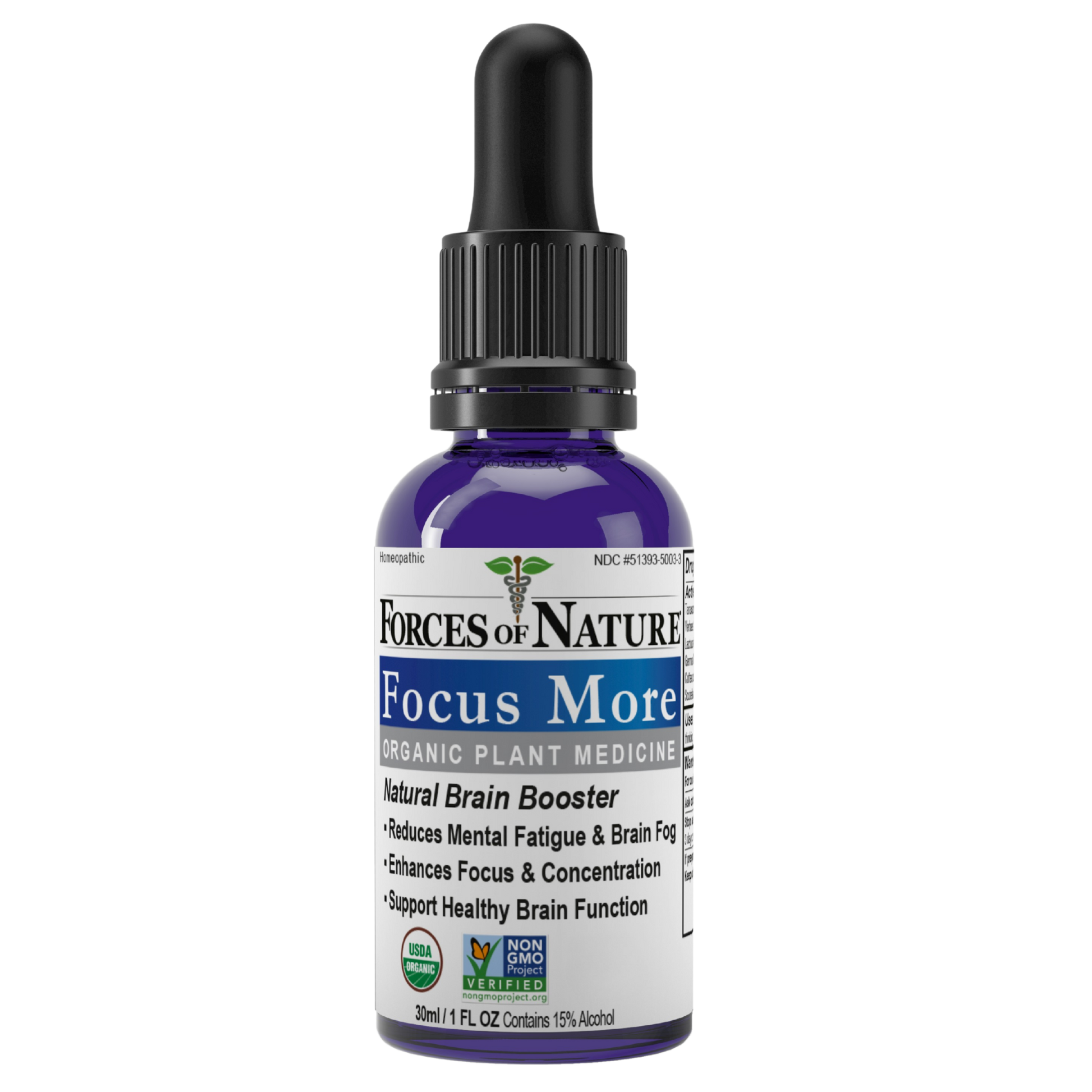 Forces of Nature Focus More acts to support sharper thinking, alertness, and productivity the natural way. This unique formula blends certified organic homeopathic medicines to help improve concentration, support memory, and ease mental fatigue without the jitters or crashes that come with conventional stimulants. Active ingredients like Taraxacum Officinale (Dandelion) with its antioxidants and vital compounds for mental clarity, Verbena Hastata (Verbena), and Lactuca Virosa (Wild Lettuce) to calm the nervous system for improved focus, are thoughtfully blended to promote balanced focus, calm energy, and clear thinking. Differently than common over-the-counter focus remedies that contain synthetic stimulants, or harsh chemicals that can be tough on your stomach, Focus More is a clean, plant-based medicine, gentle, and non-habit forming. Designed to be used as needed daily.
