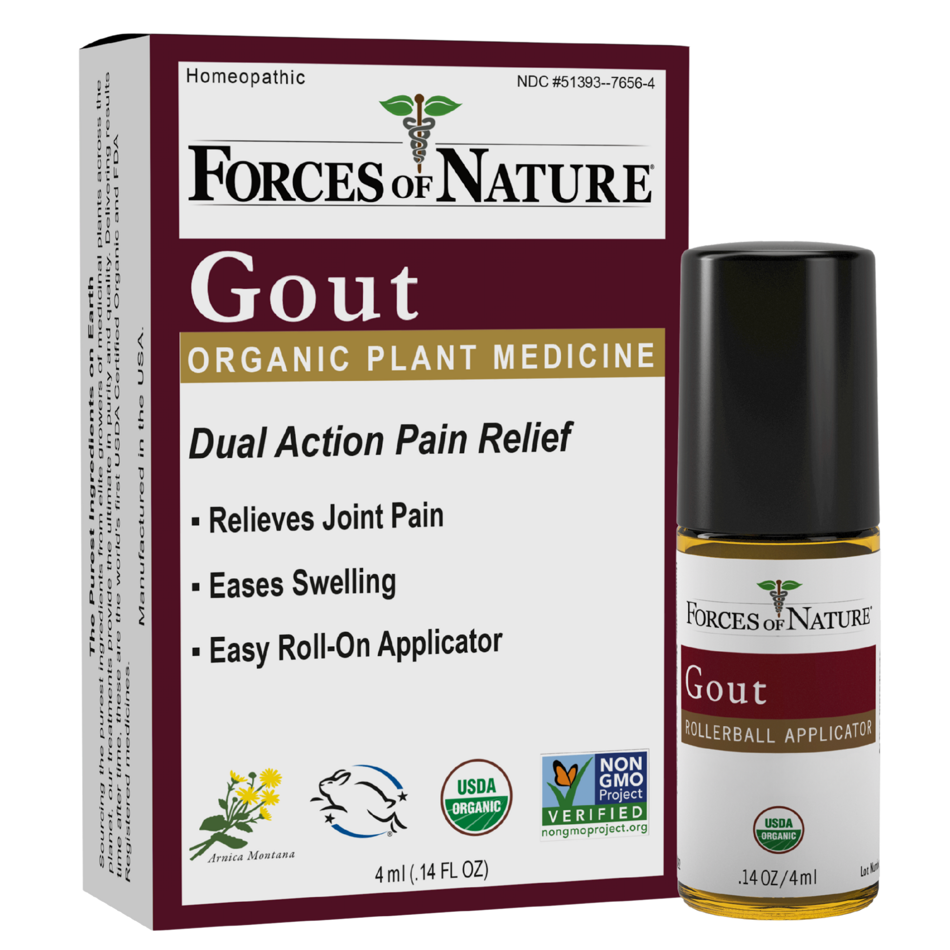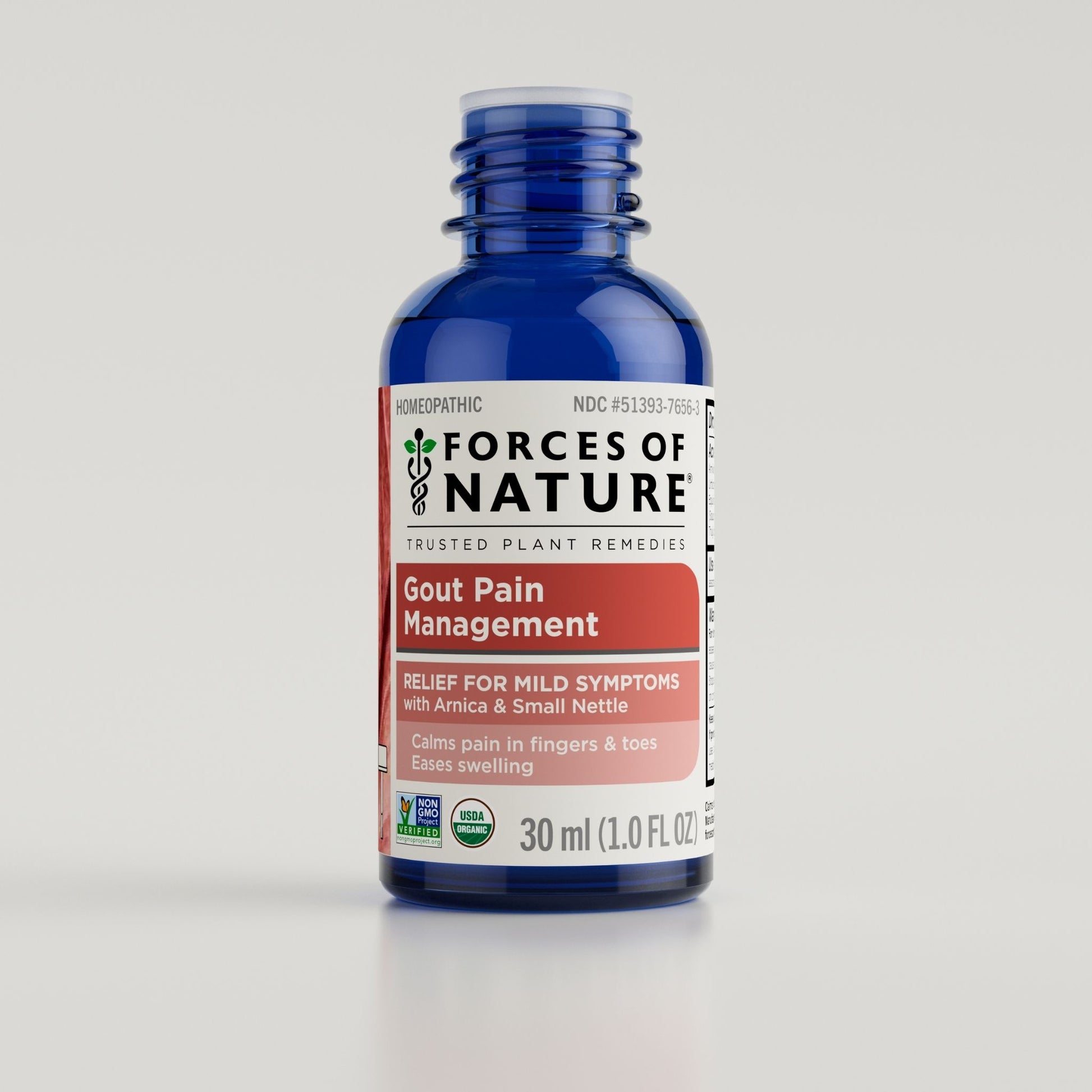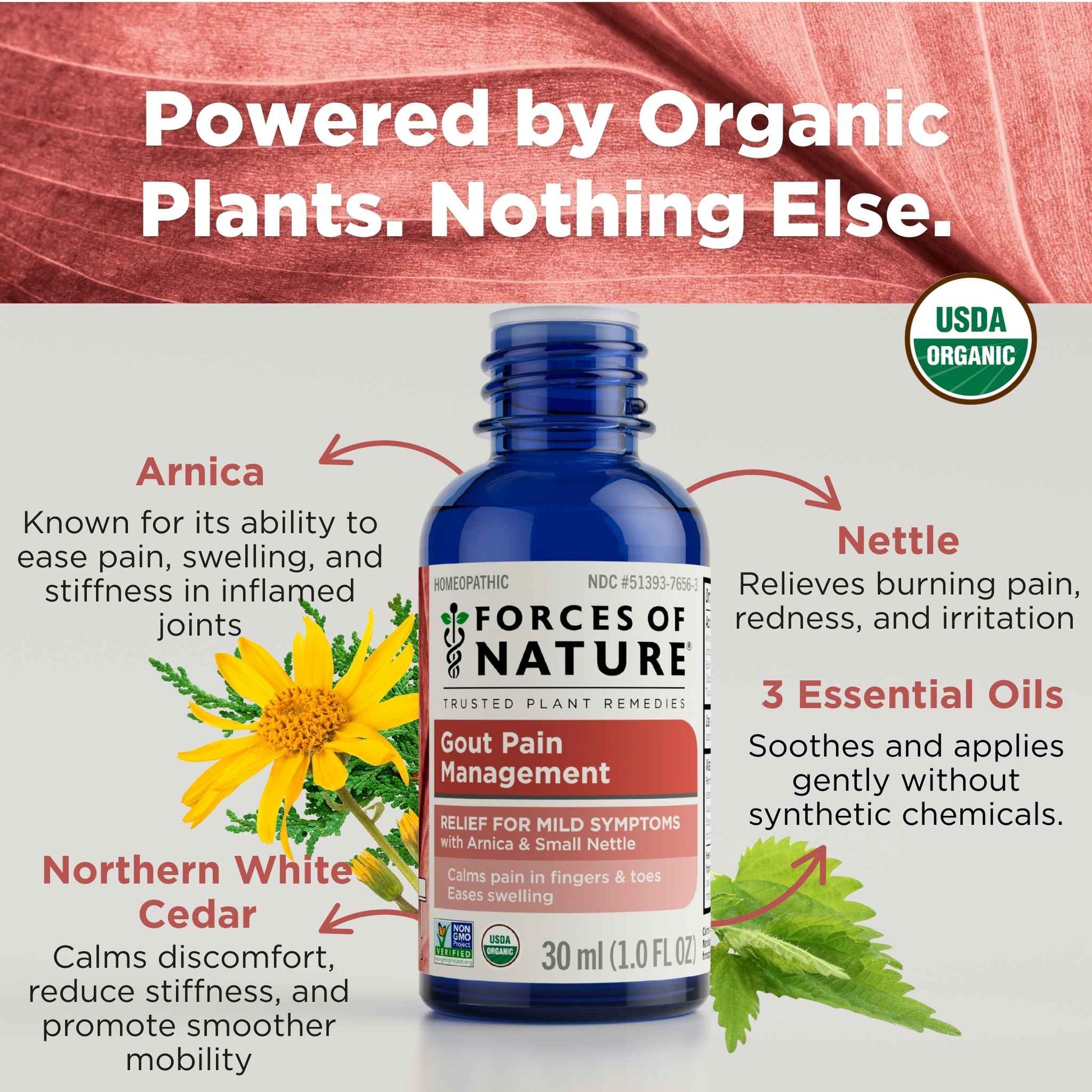 Forces of Nature Gout Pain Management is a powerful, plant-based formula made to calm inflammation and support your body’s natural healing process. Featuring organic homeopathic medicines, including Arnica Montana (Arnica) prized for its ability to ease pain and swelling, (Stinging Nettle) known to support healthy uric acid balance, and Thuja Occidentalis (Northern White Cedar) that targets joint discomfort, this clean medicine targets the symptoms of gout discomfort to give you real relief. The medicinal blend is formulated with pure essential oils, like German Chamomile, to facilitate absorption and provide an overall calming. Many gout remedies are supplements and may come with side effects and interaction risks. Gout Pain Management is a topical product that works in harmony with your body to naturally restore comfort and mobility and can be used daily as needed.