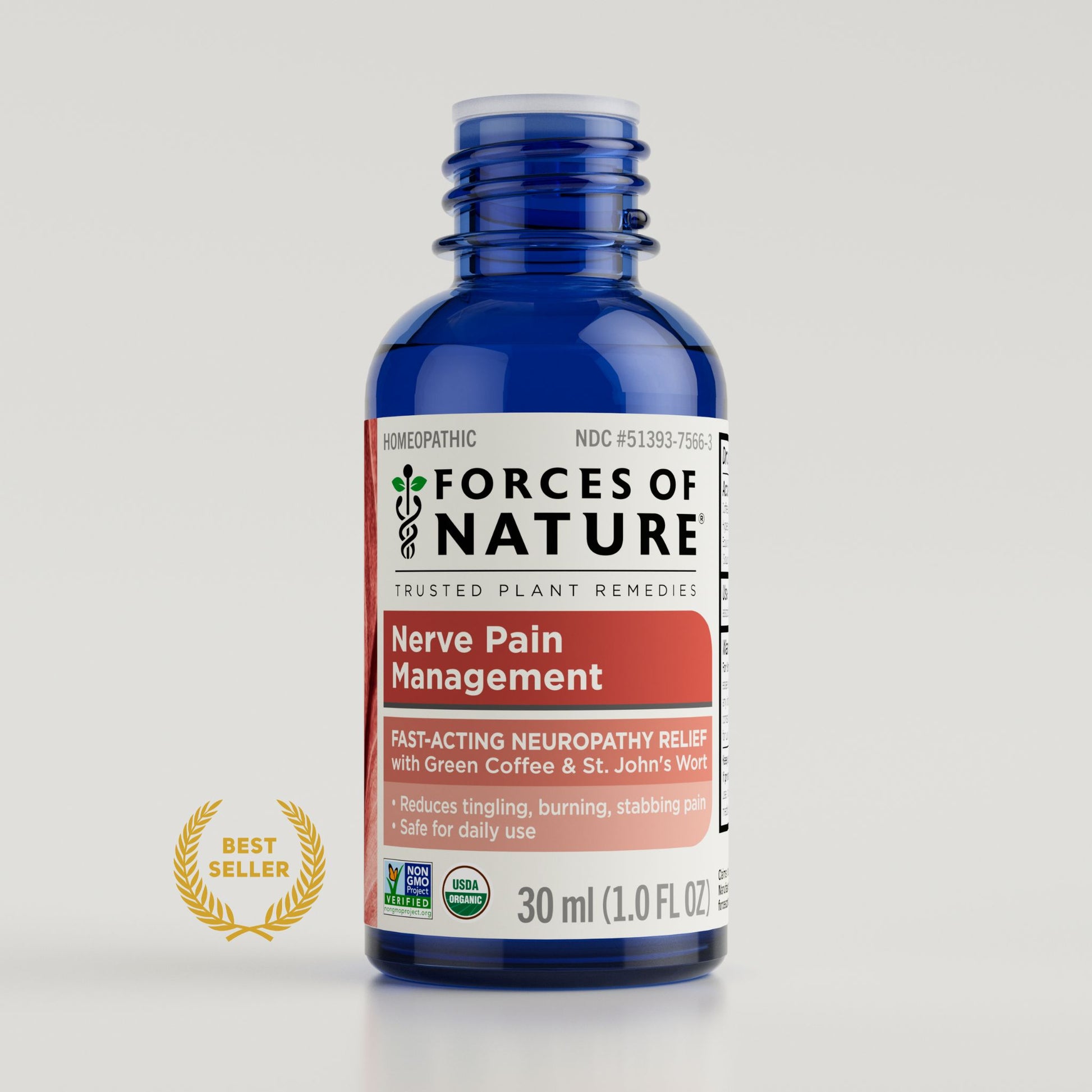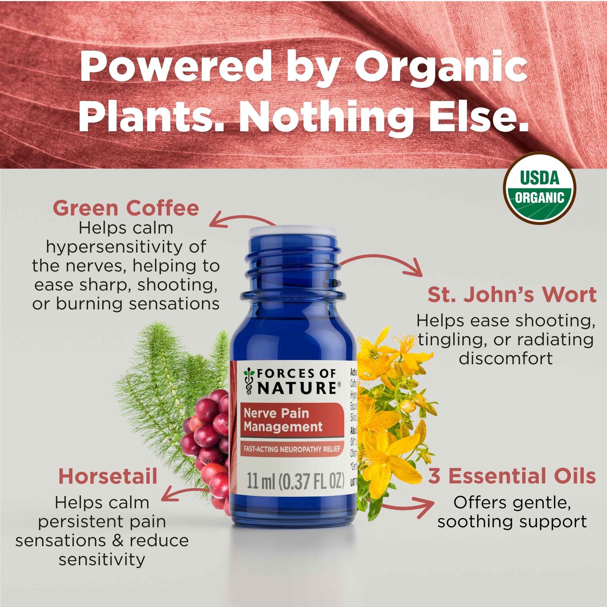 Forces of Nature Nerve Pain Management is designed to provide fast-acting neuropathy relief. If you’re experiencing burning, tingling, and shooting discomfort, this is a powerful blend of certified organic homeopathic medicines, including Coffea Cruda (Green Coffee) praised for its potent anti-inflammatory properties and Hypericum Perforatum (St. John’s Wort) known as a nervine tonic. These active ingredients are blended with pure essential oils, including Roman and German Chamomile, for soothing, deep penetration. Unlike common OTC pain relievers that often mask symptoms with capsaicin or menthol, our clean, plant-based medicine works with your body to calm sensitivity and restore comfort.